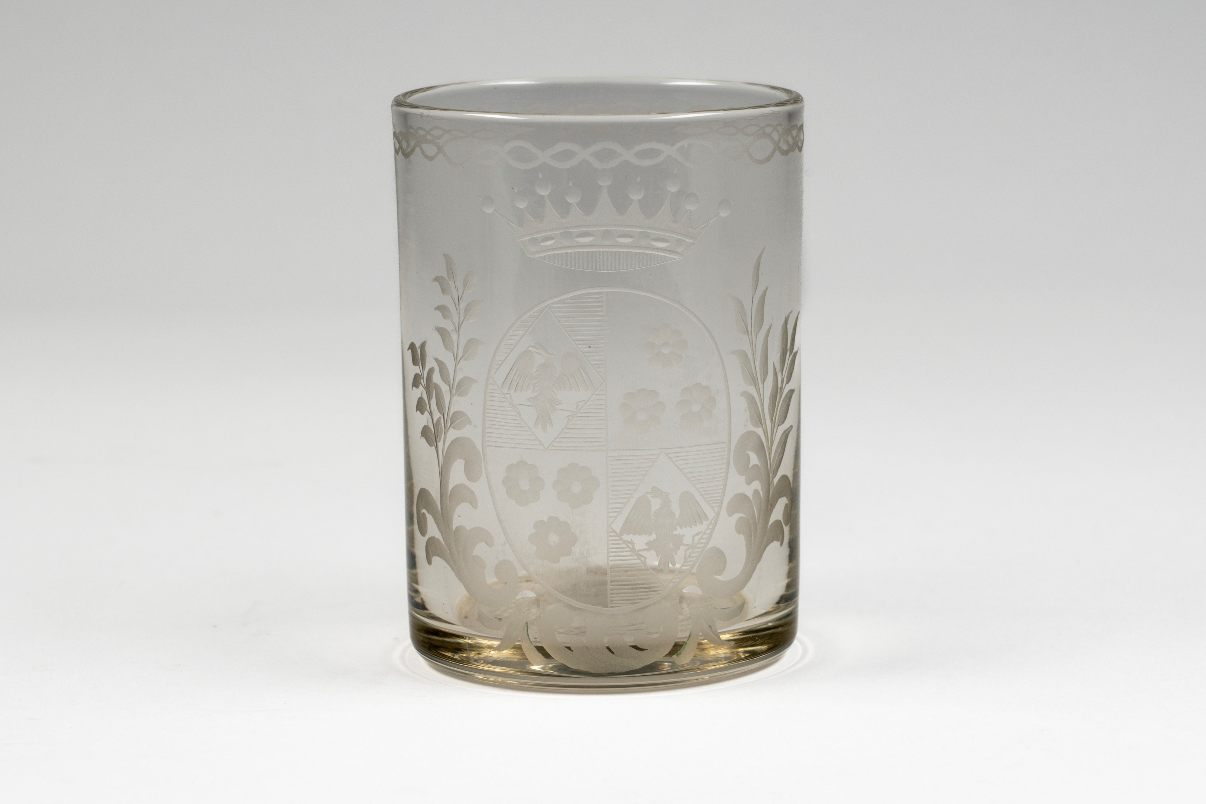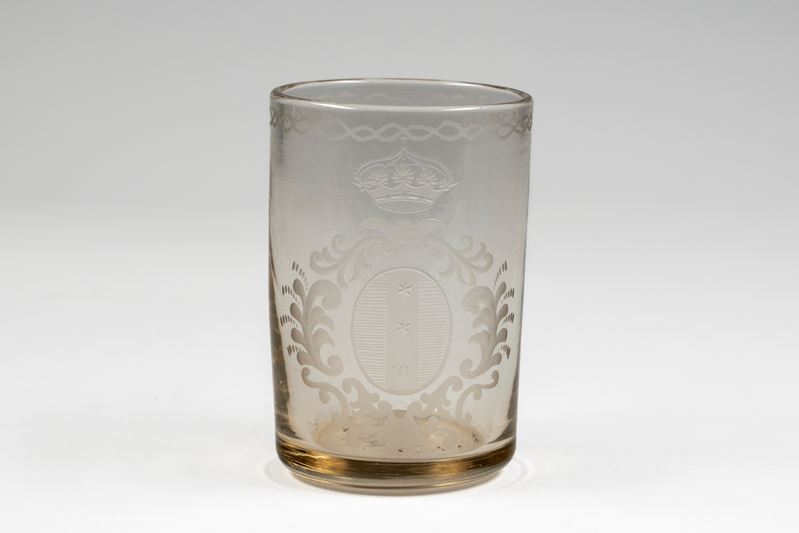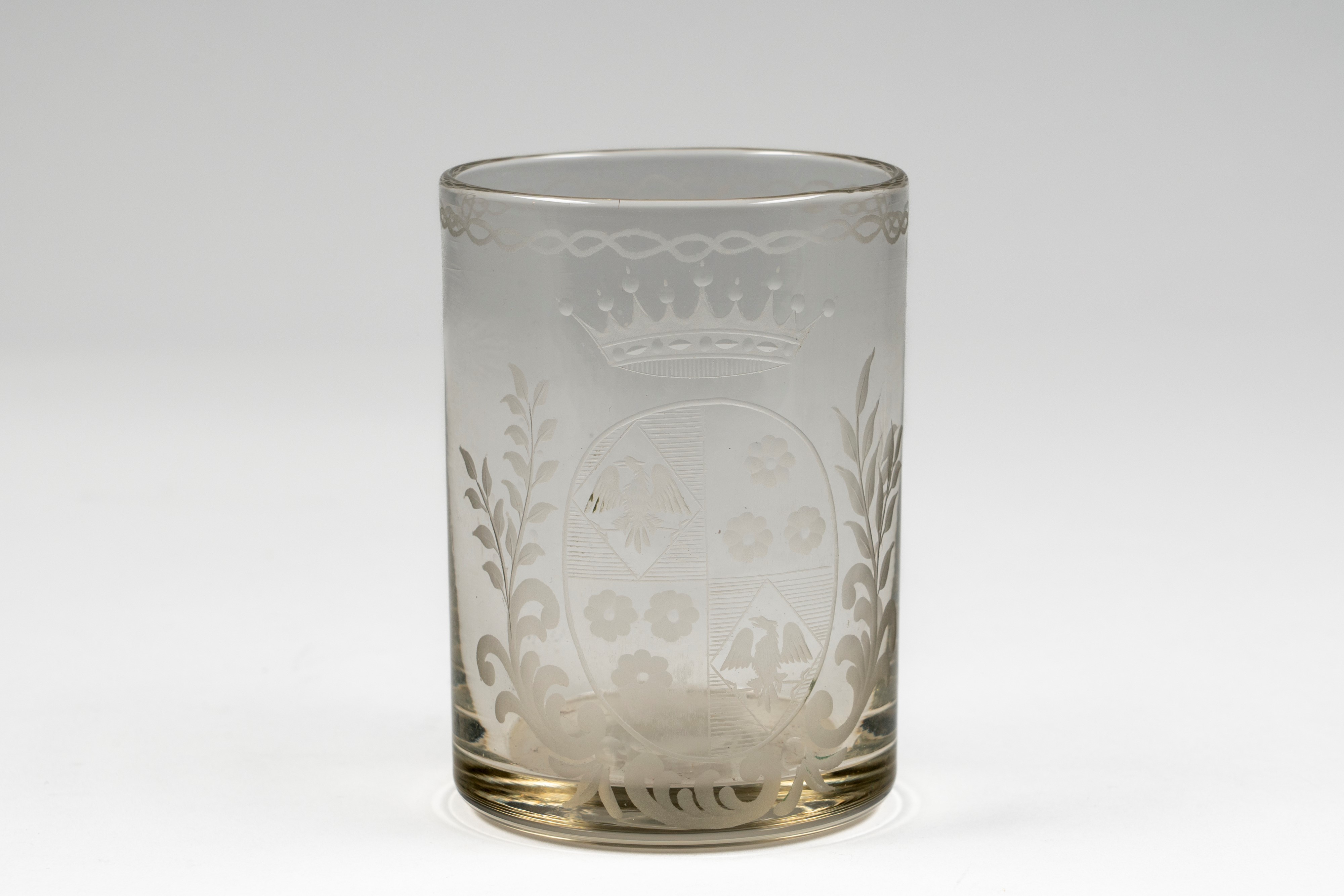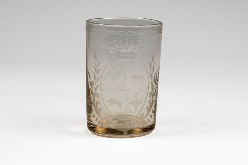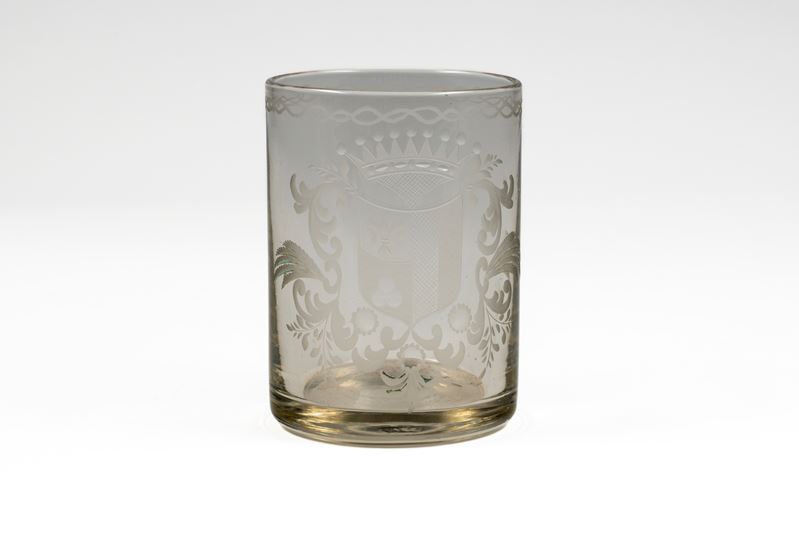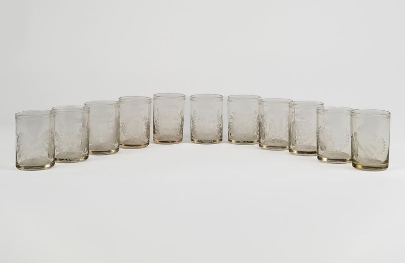 Undici bicchieri in vetro inciso con differenti stemmi araldici