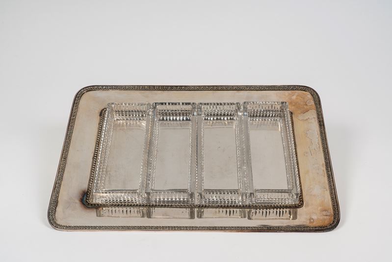 Vassoio porta vivande in metallo argentato di forma rettangolare ad angoli stondati con bordo decorato a palmette, contenitori in cristallo molato.
