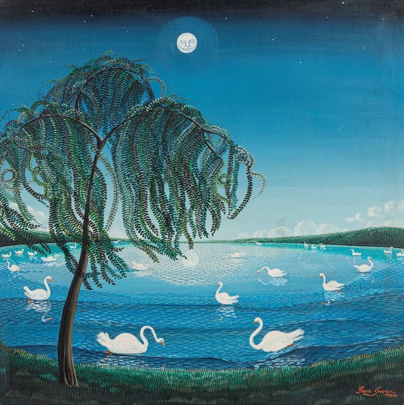 Firmato al verso sul telaio: Irene Invrea, Plenilunio con cigni