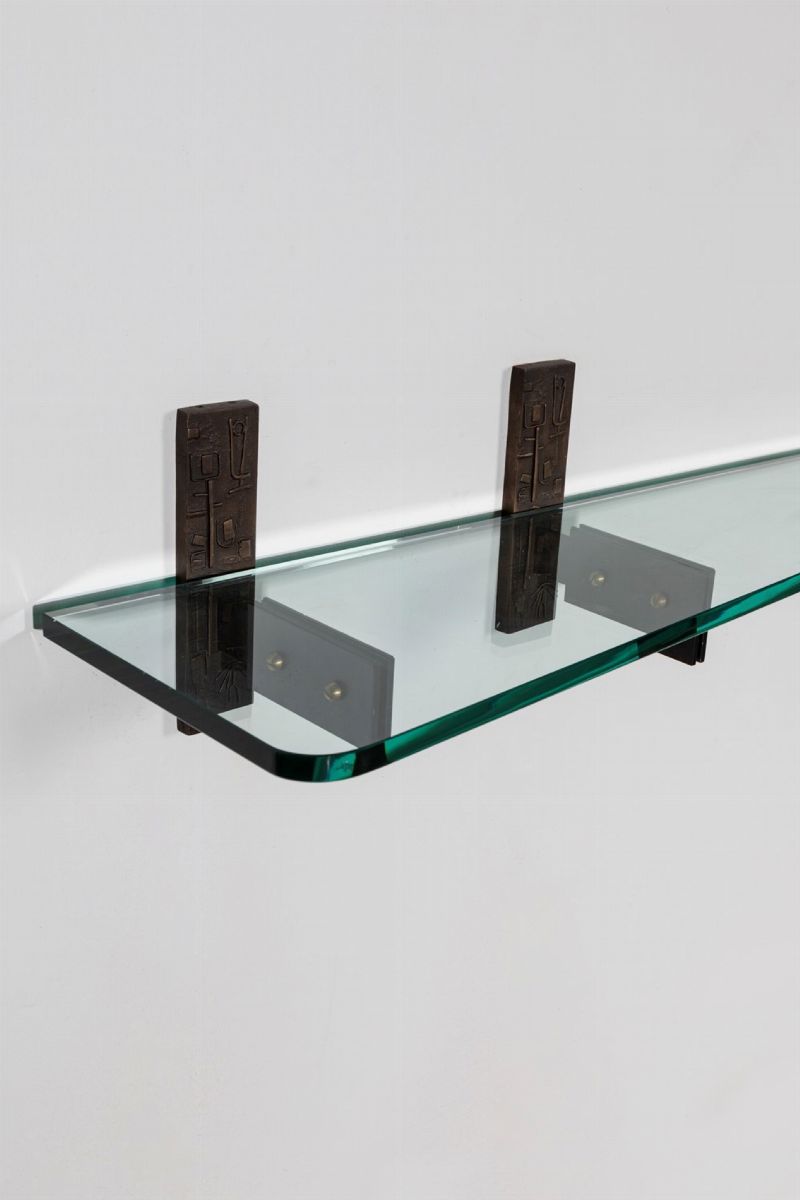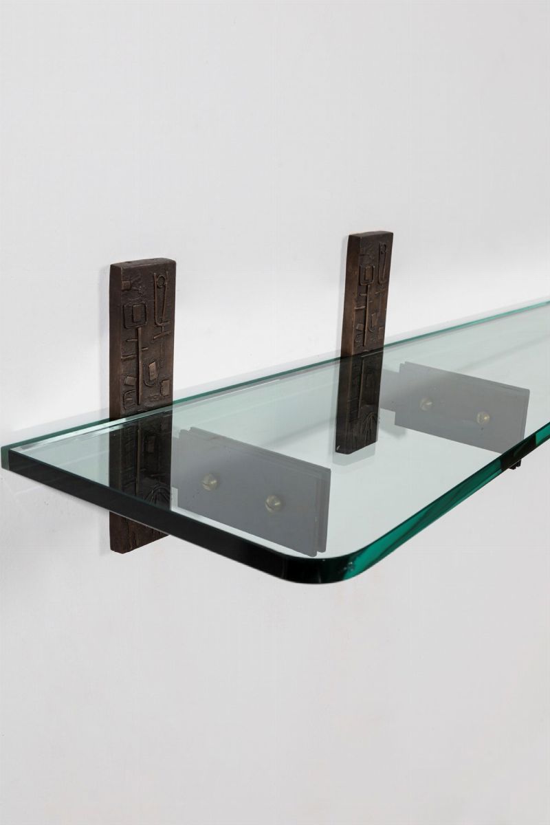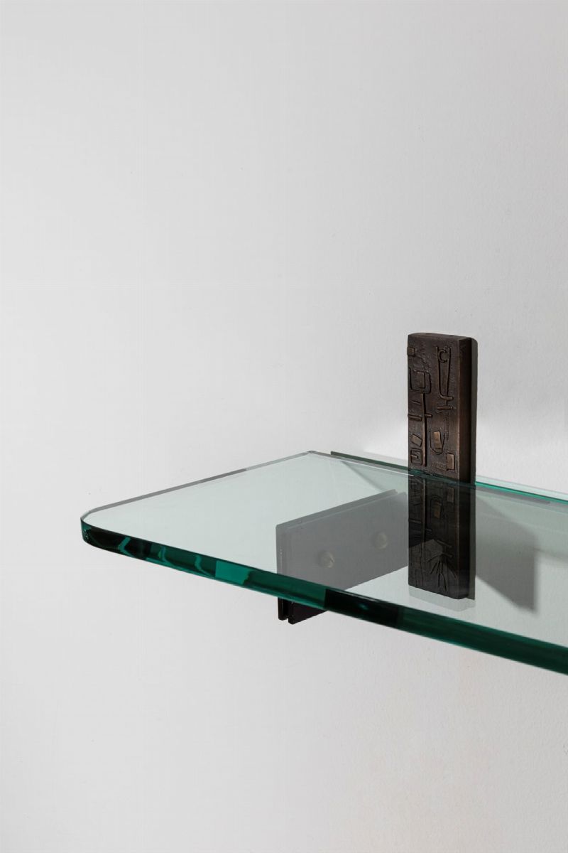 a parete in vetro molato con sostegno in bronzo istoriato. Realizzata da Luigi Fontana nel dicembre 1959.