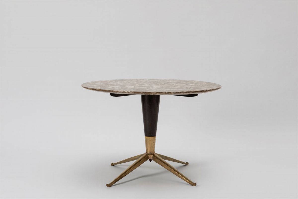 con gambe in metallo verniciato e ottone, piano in marmo.