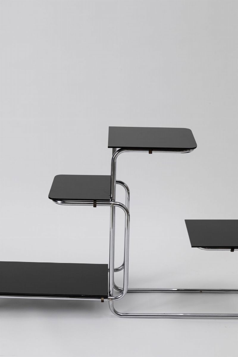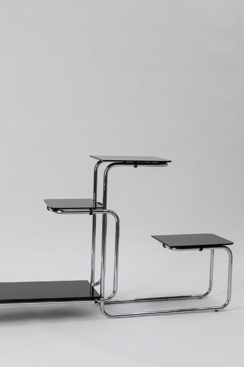 struttura in tubolare di acciaio cromato, mensole in vetro originale d’epoca di colore nero con particolare lavorazione a righe nel lato sottostante.Fermavetri originali in gomma rigata.