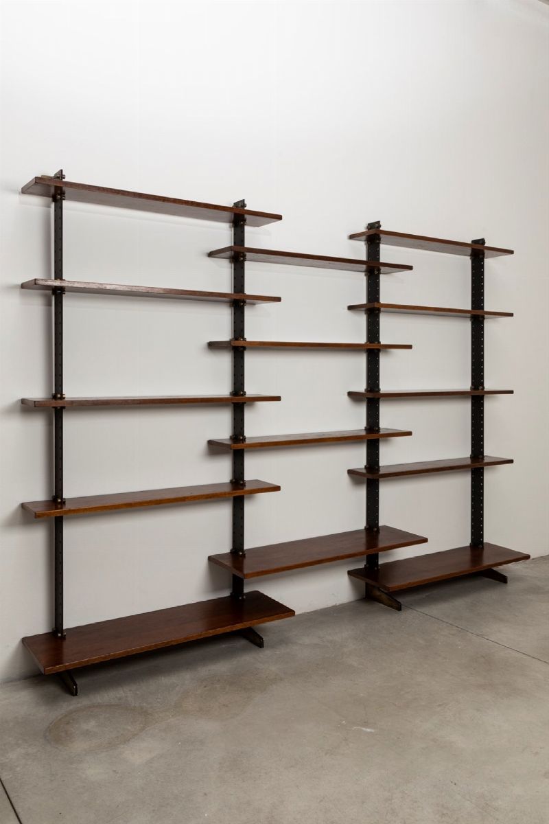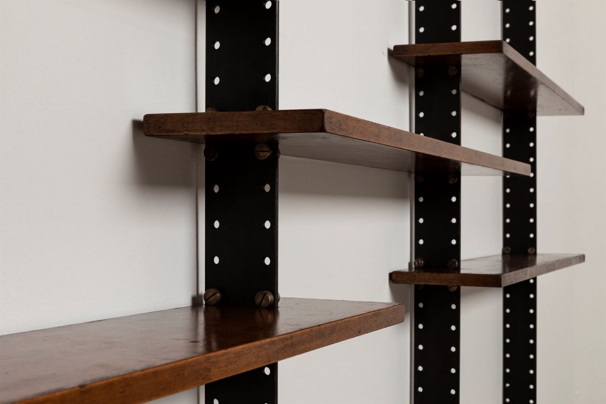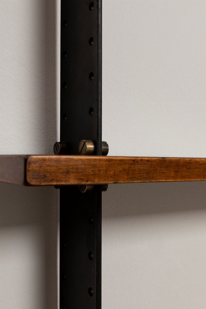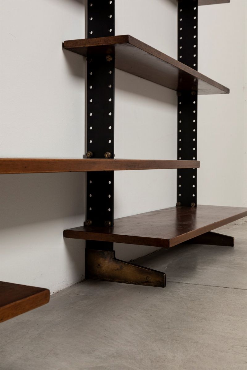 con montanti in metallo laccato e ottone. Mensole in legno.
