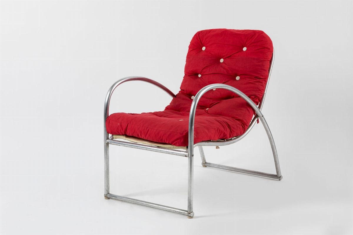nello stile di Giuseppe Pagano in tubolare metallico e cuscini in tessuto.