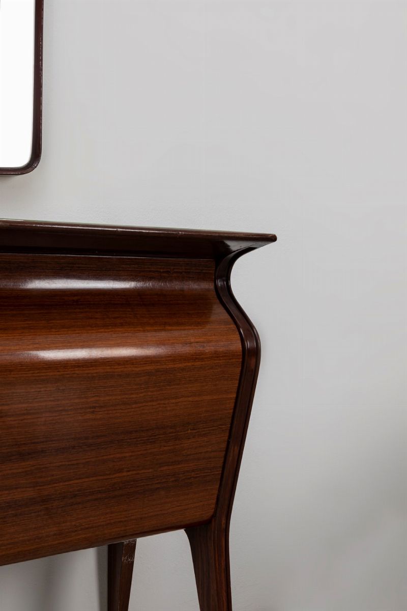 legno massello e impiallacciato in palissandro indiano, guarnizioni in ottone, piano in vetro retro verniciato e interno in acero.