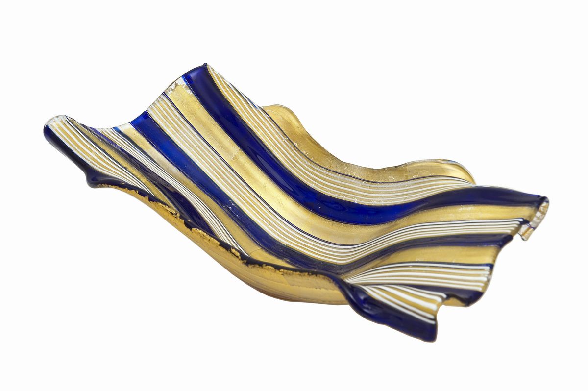 composta dall'unione di canne, fili e fasce di vetro lattimo, blu e cristallo; doratura sul lato inferiore. Firma a graffio Barovier + Toso Murano cm h 8 x 30 x 11