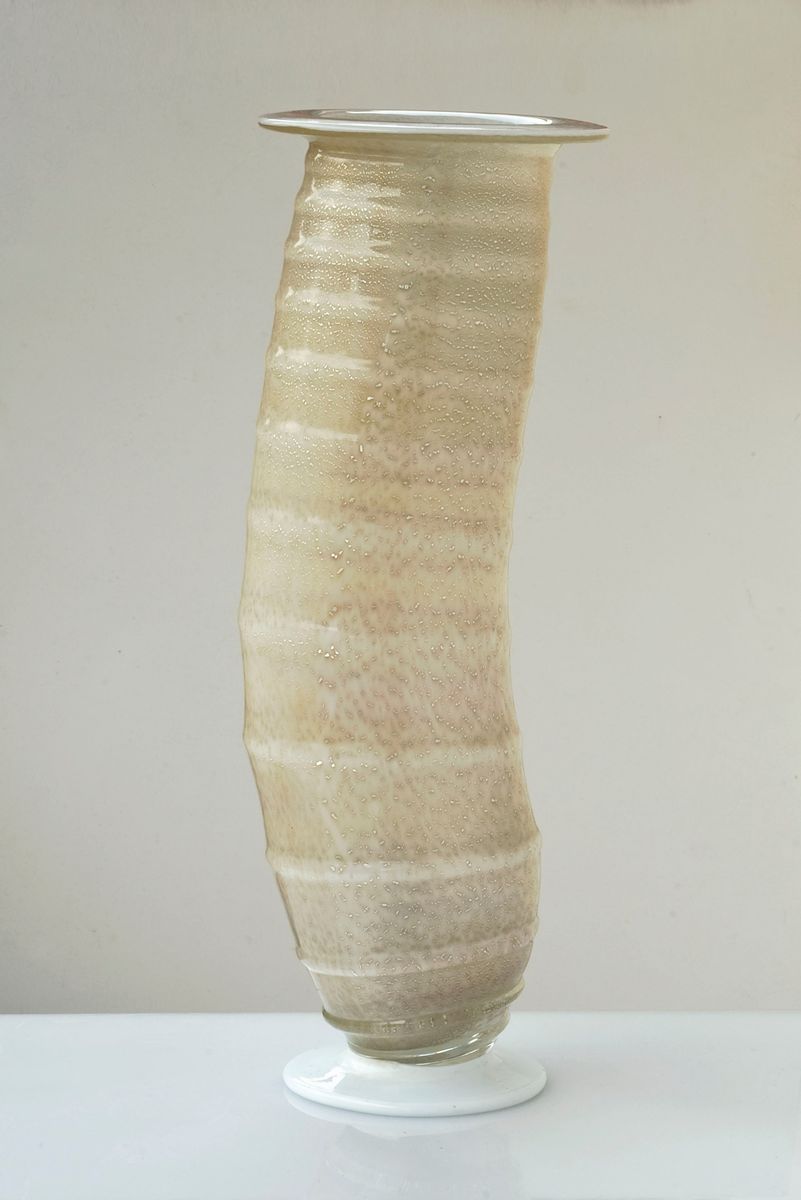 in vetro lattimo incamiciato e foglia d'argento.Piede in pasta di vetro bianca. Firma a graffio Toso Murano.