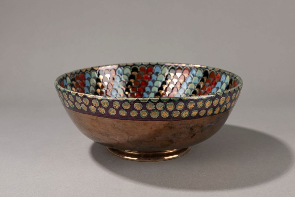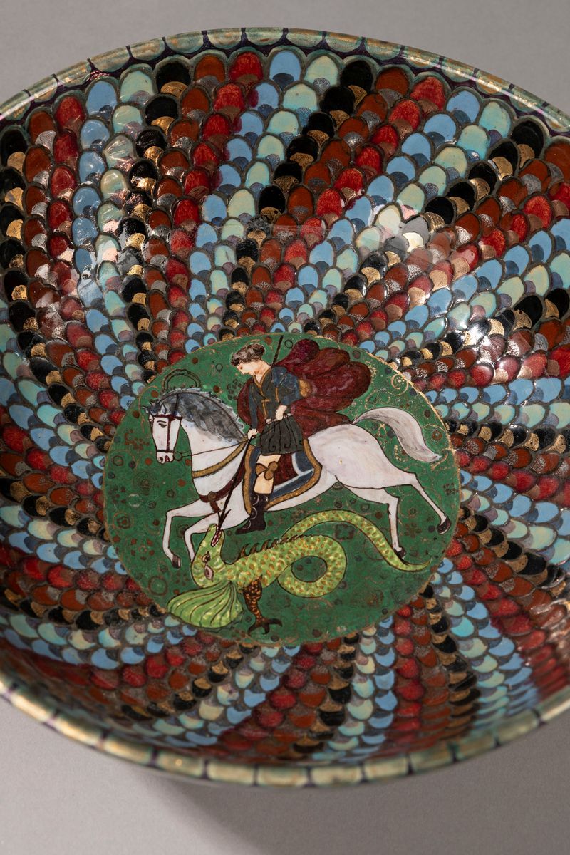 in maiolica a smalti policromi con finitura a lustro metallico. Immagine centrale di San Giorgio.