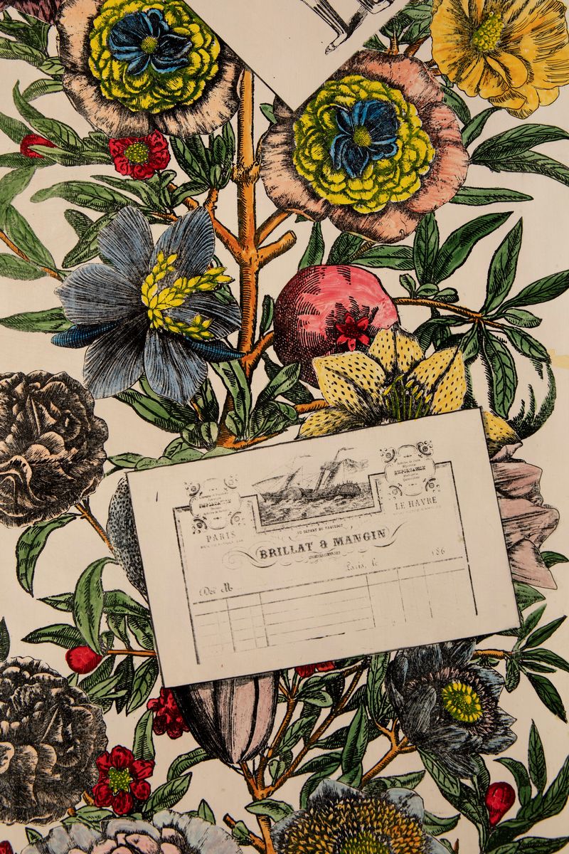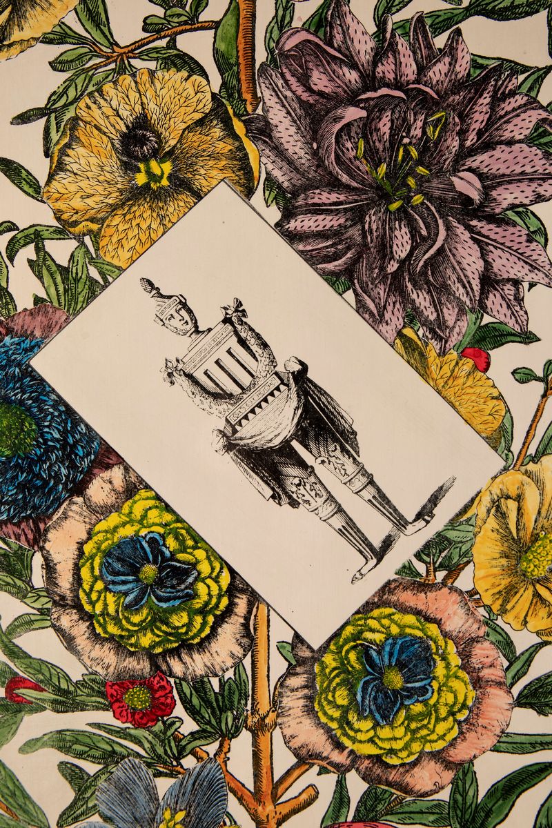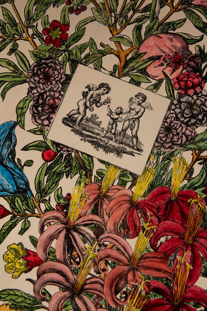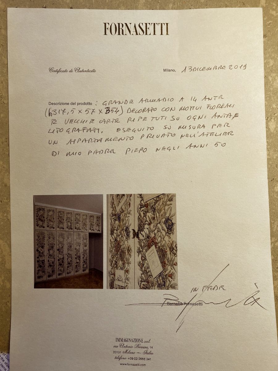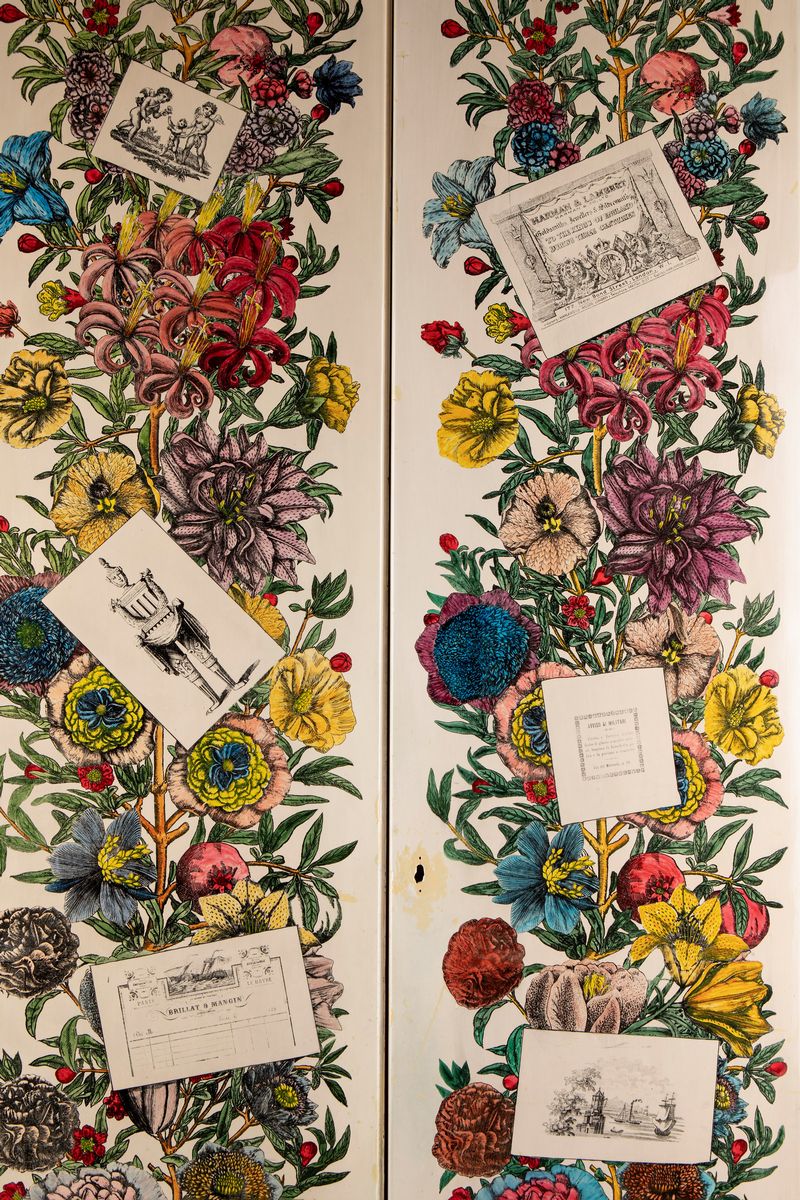 di pannelli decorativi composto da 6 porte grandi e 8 piccole con litografie policrome di composizioni floreali.