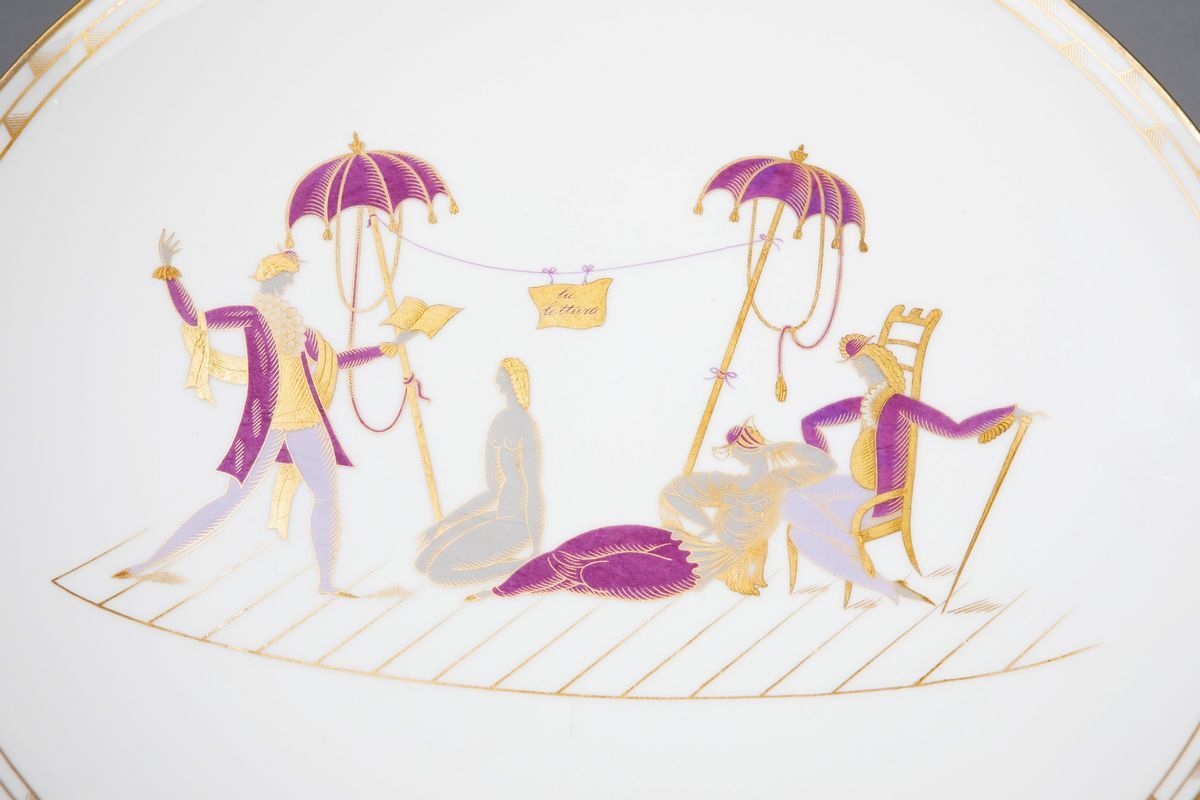piatto in porcellana decorata e particolari dorati.