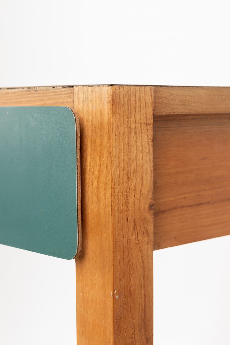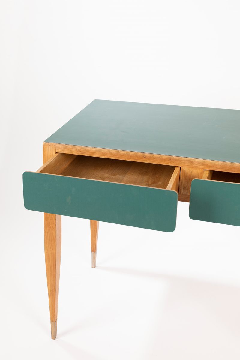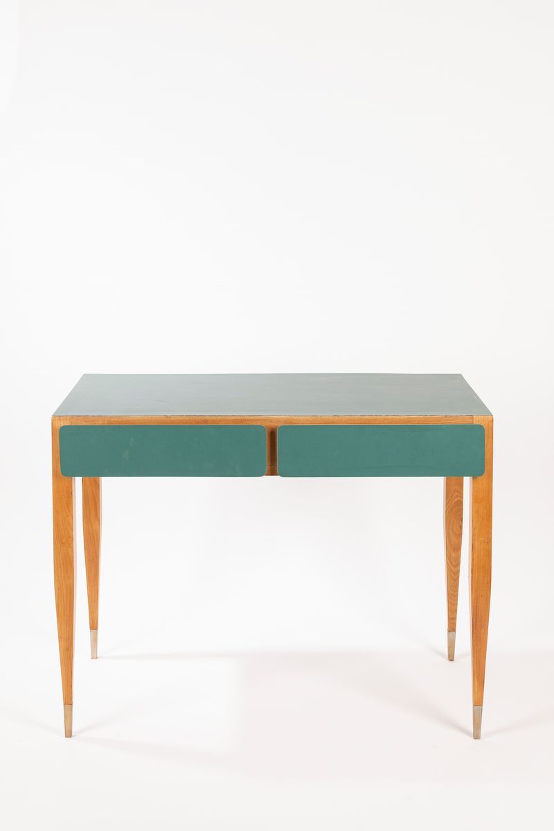 in legno con dettagli in ottone, piano e due cassetti in formica colorata. Produzione Giordano Chiesa.Provenienza: Hotel Parco dei Principi, Roma