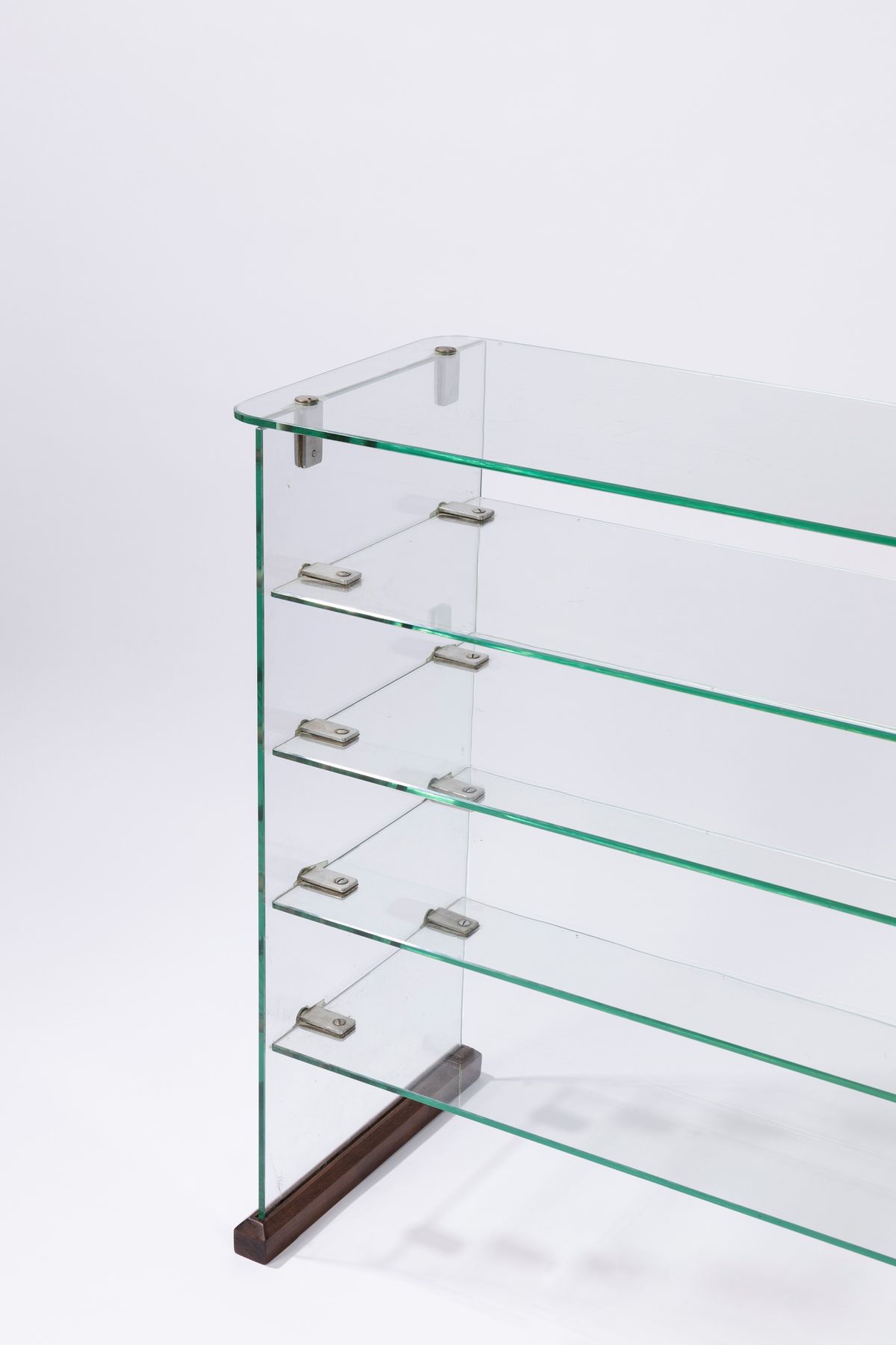 da centro.Struttura in cristallo temperato marchiato Vitrex in ogni elemento. Dettagli in metallo nichelato. Sostegni in legno.