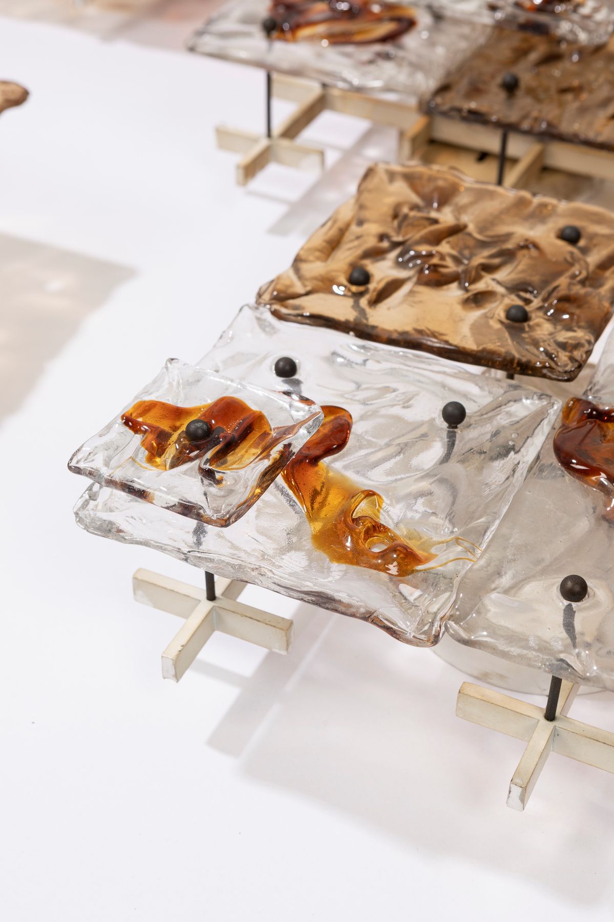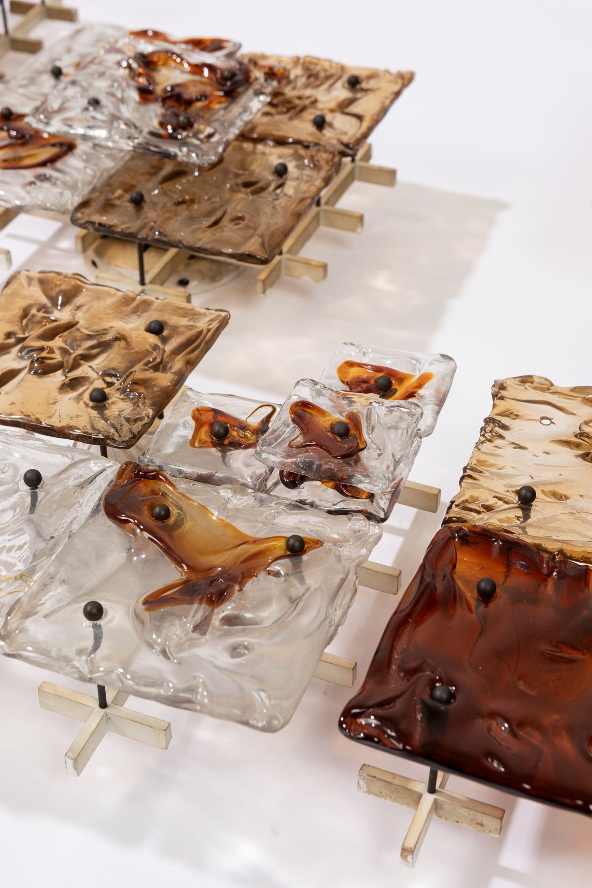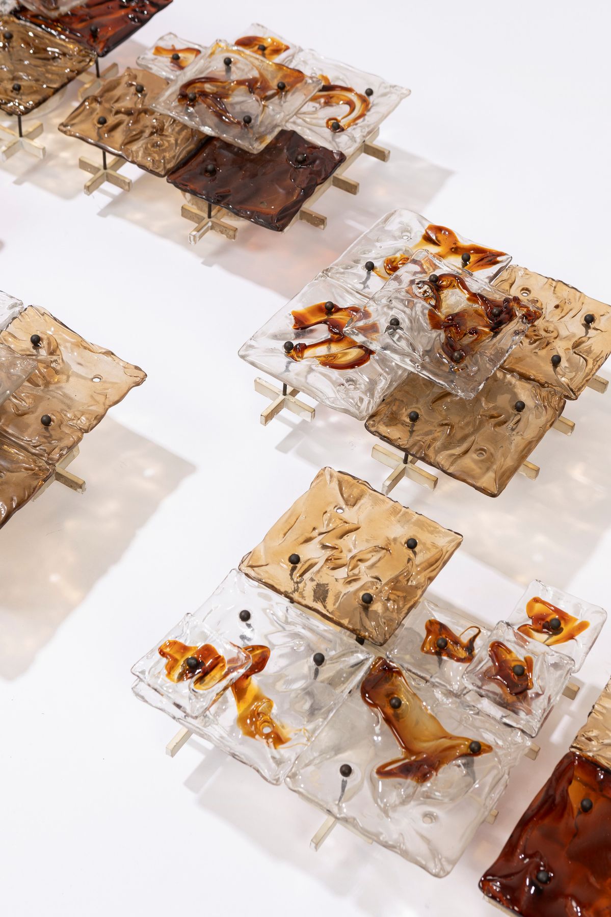 Nove appliques modello Patchwork. Struttura in metallo laccato, supporti in ottone e piastre in vetro di Murano lavorato a mano. Marchio originale della produzione.Prima edizione.