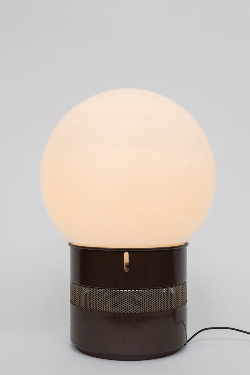 lampada da tavolo con struttura in metallo laccato e diffusore in vetro opalino.