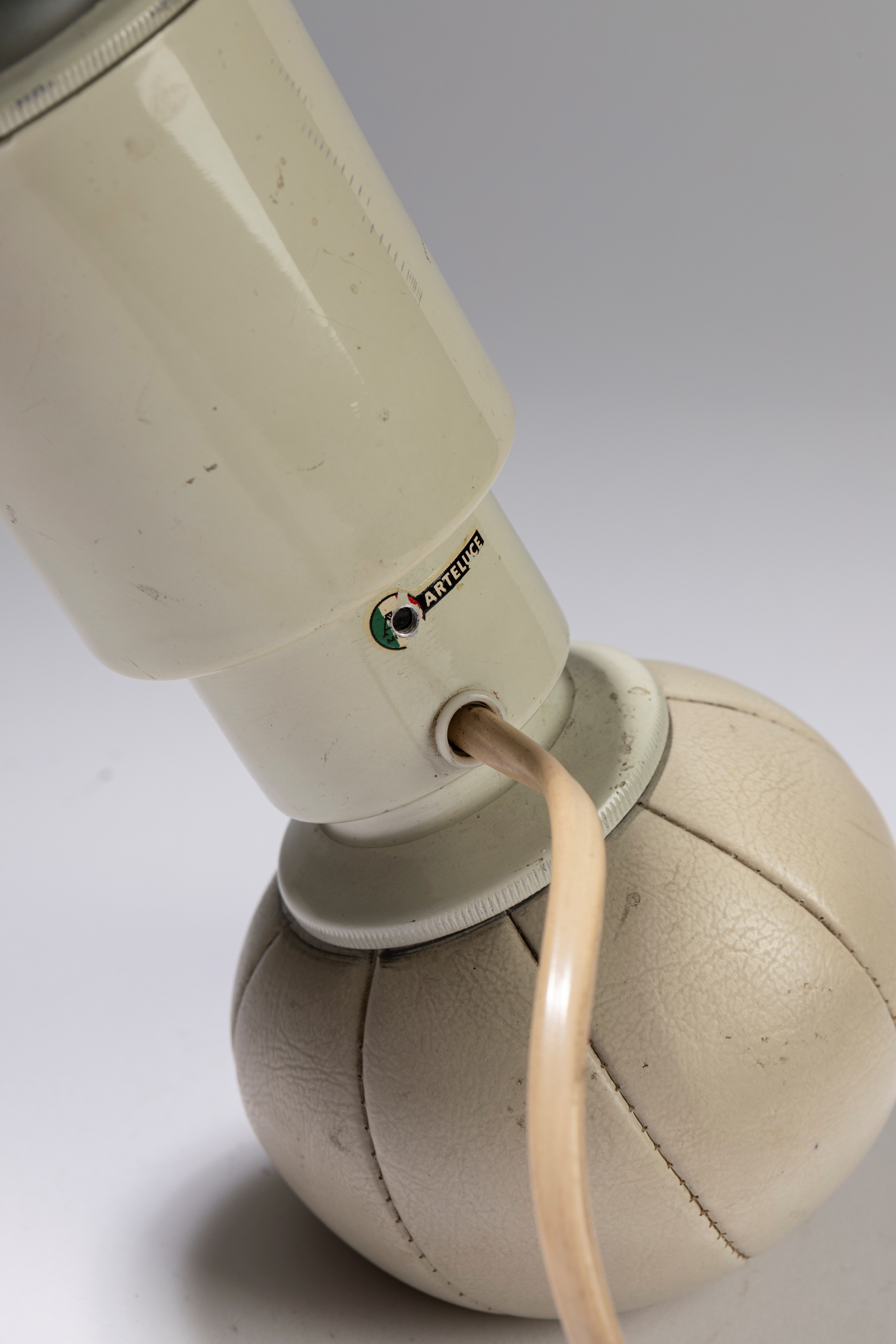 lampada da tavolo in metallo verniciato con base in pelle e sfere metalliche all'interno.
