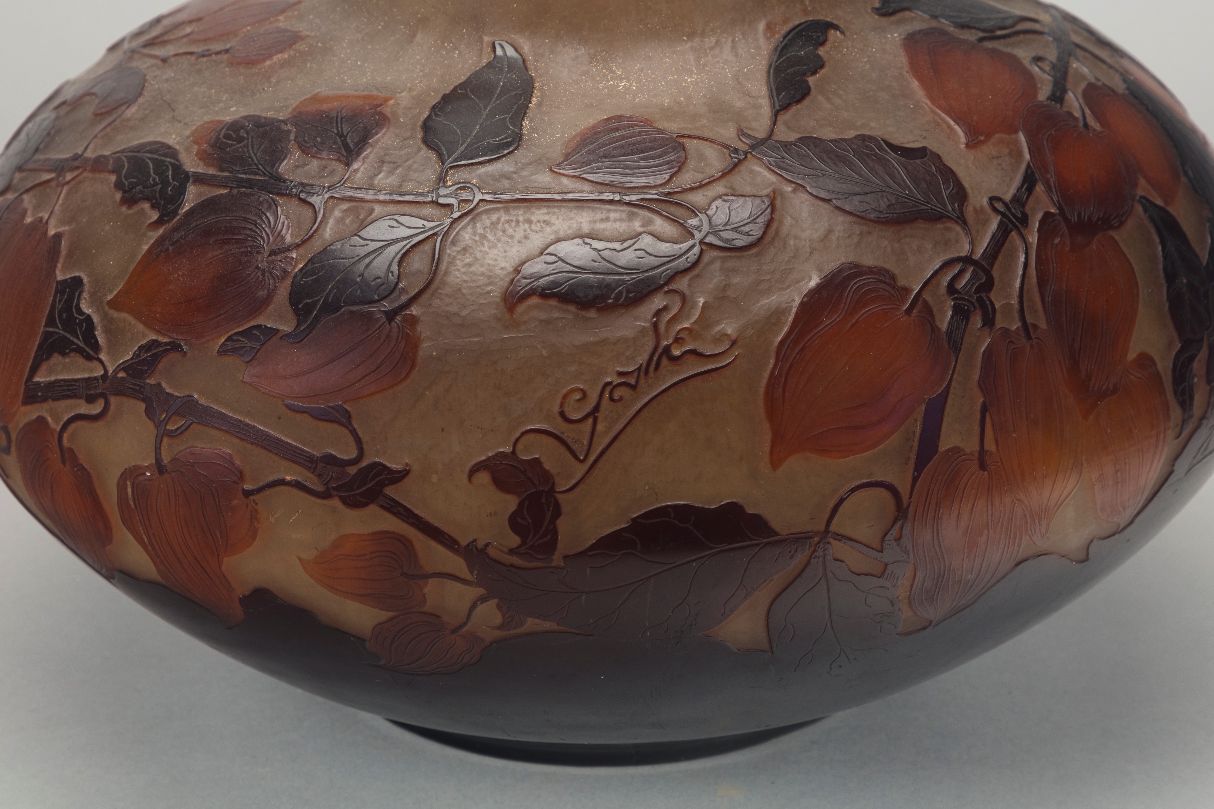 in vetro a strati di colore, lavorazione a cammeo, decorazione con foglie e bacche di alkekengi.