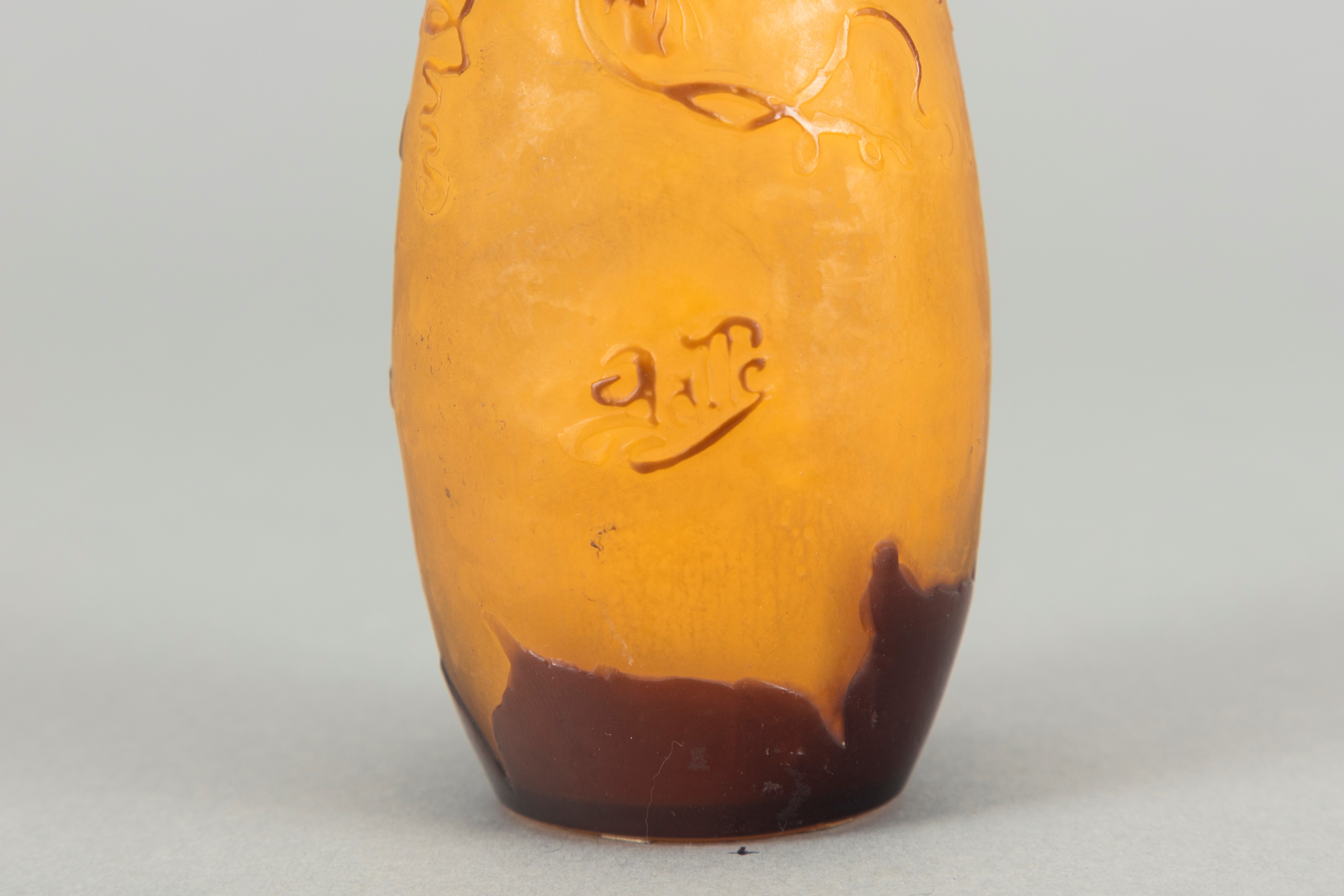 in vetro a strati di colore, lavorazione a cammeo, decorazione con tralci di vite rampicanti.