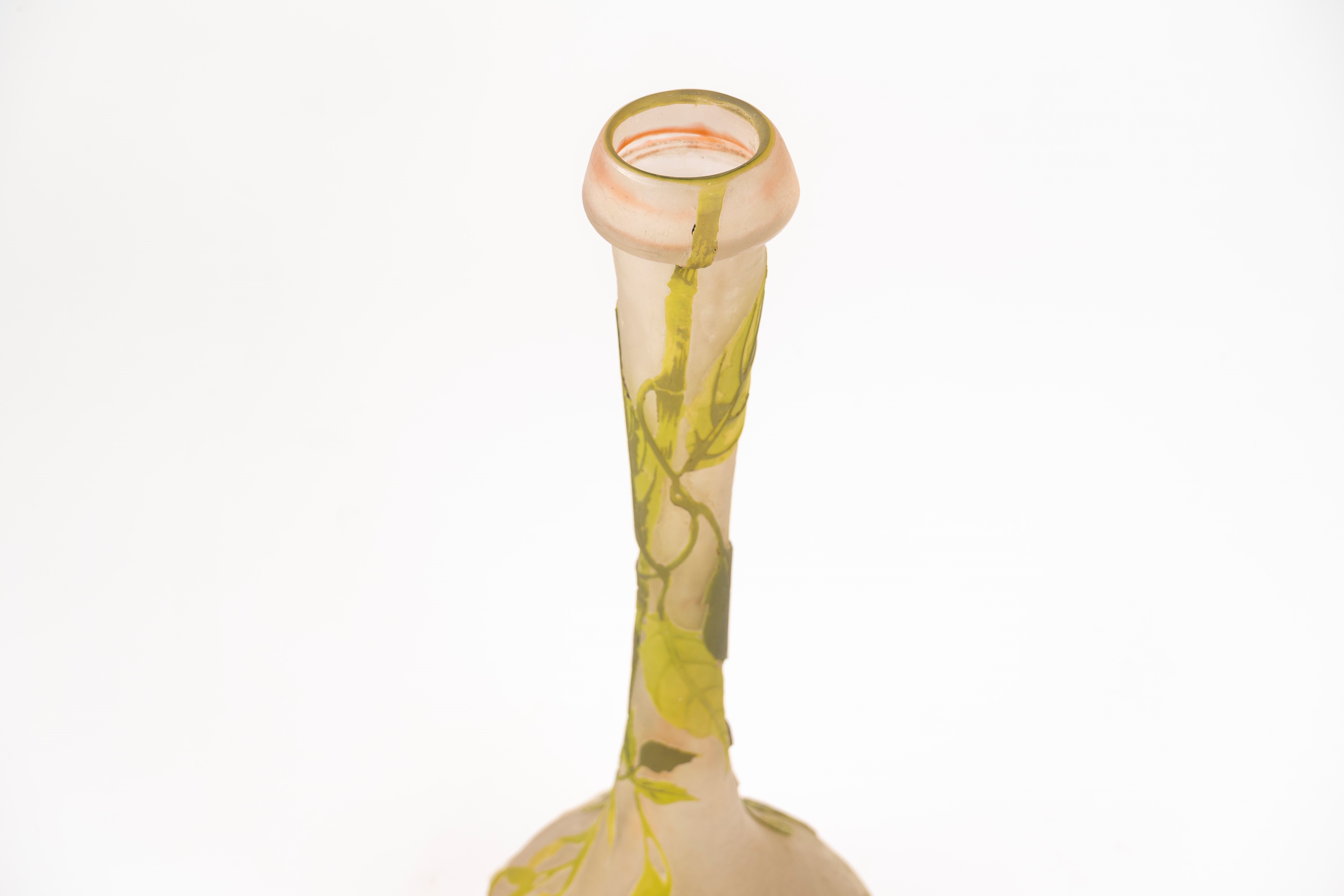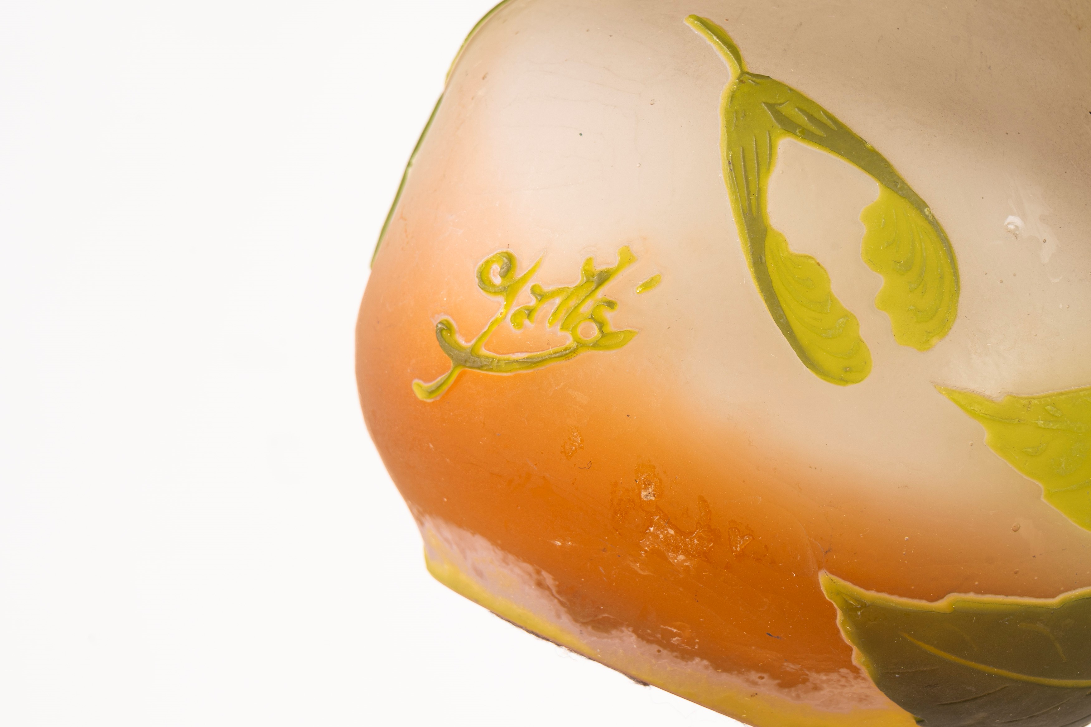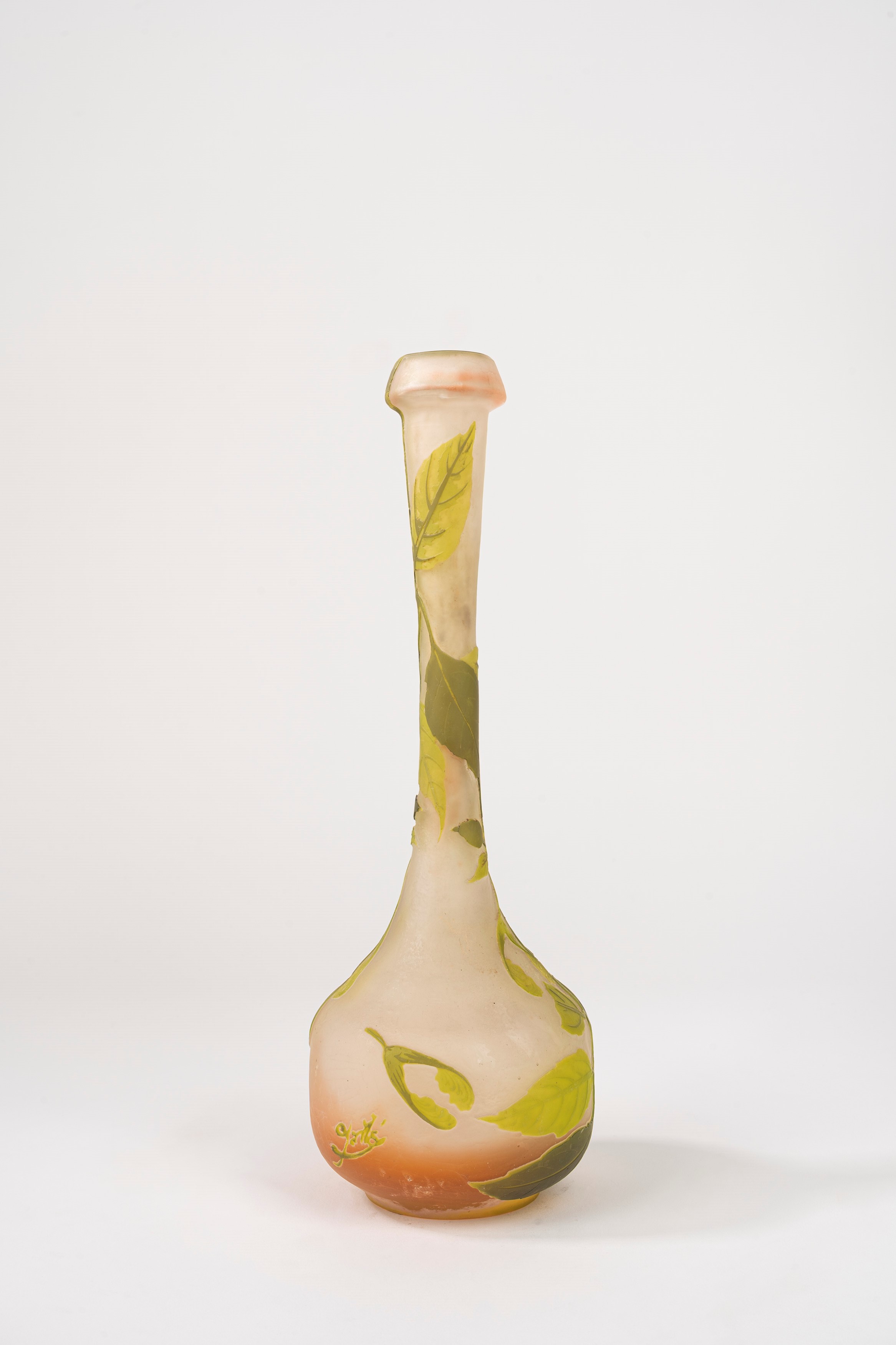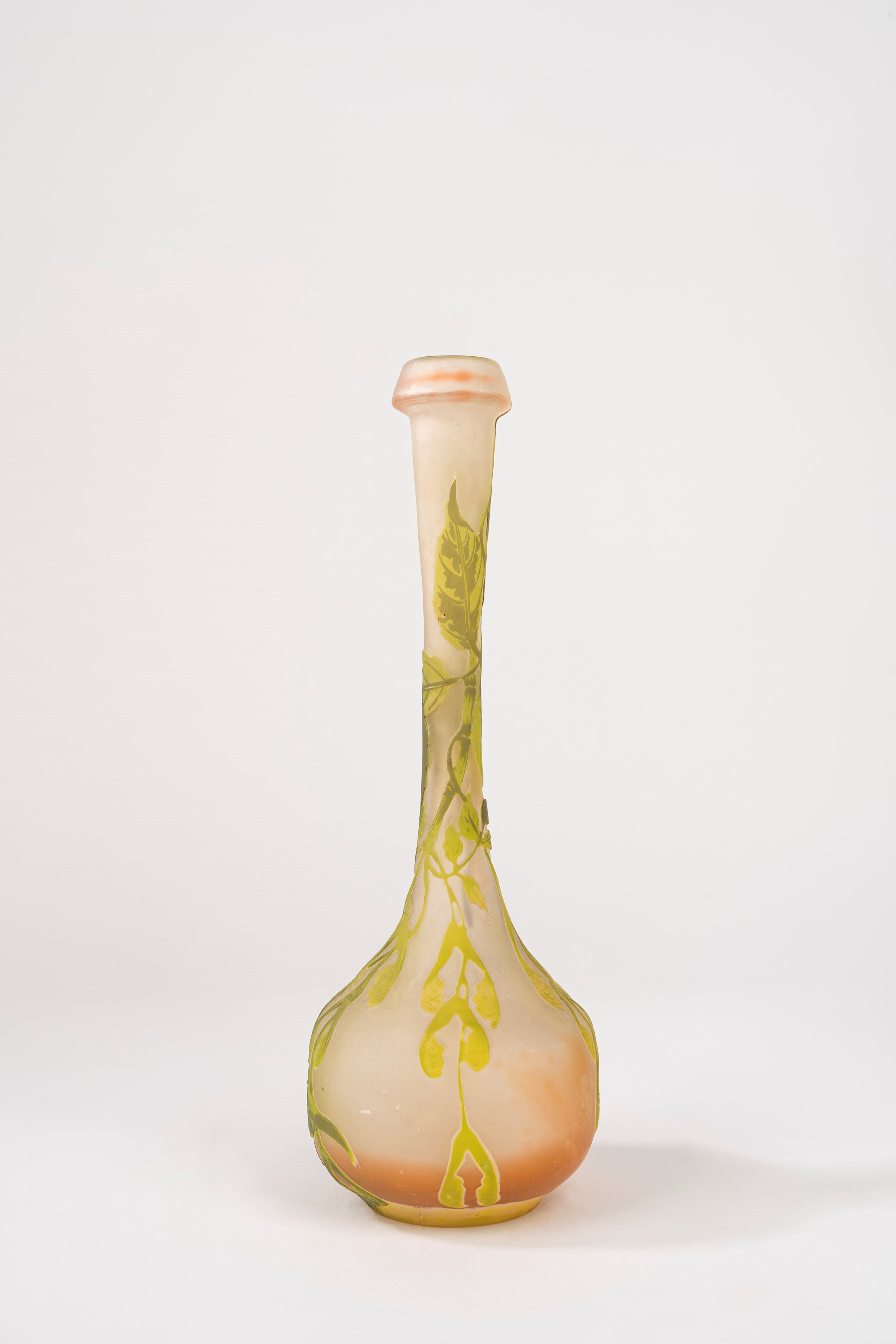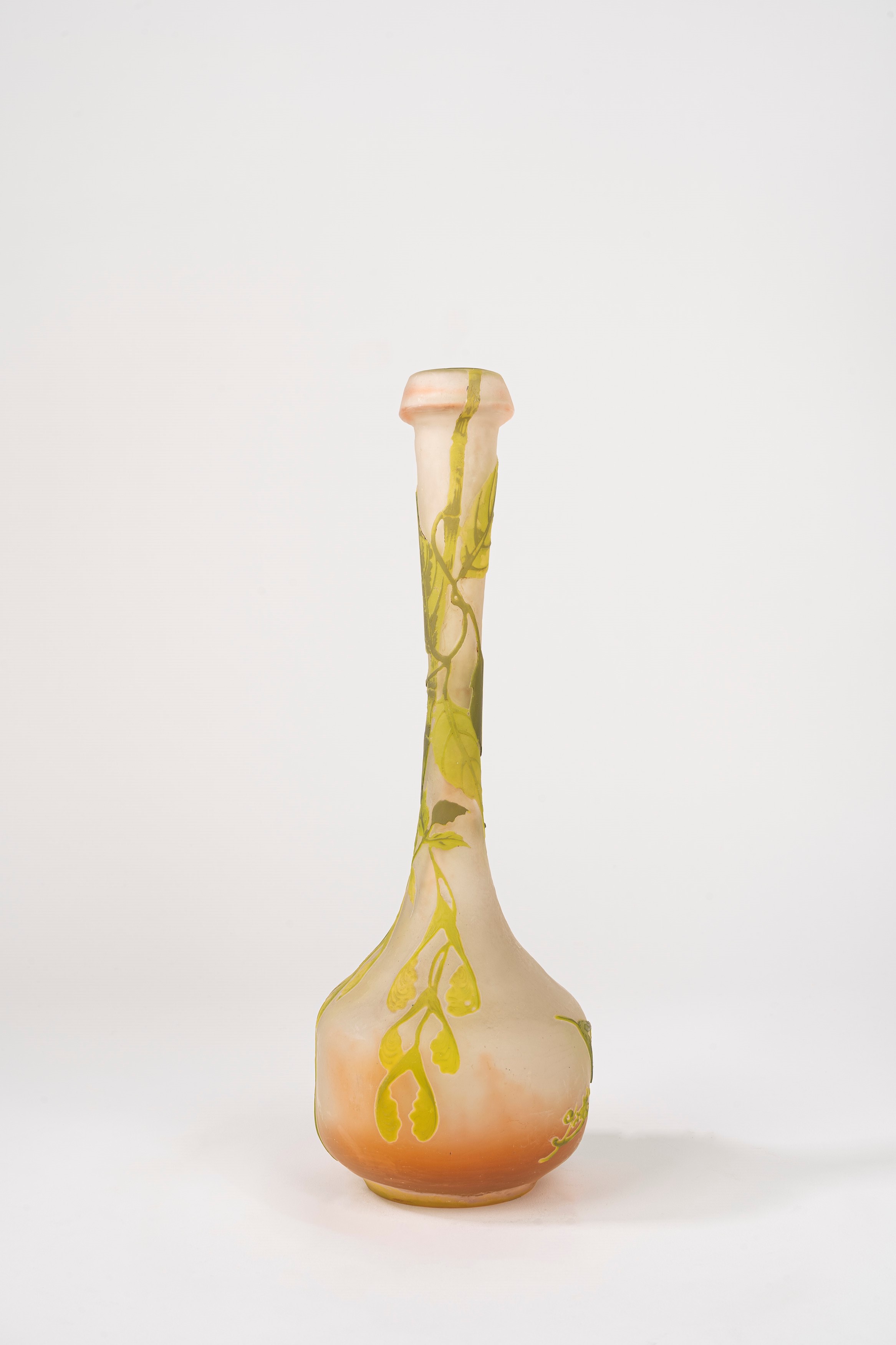 in vetro a strati di colore, lavorazione a cammeo, decorazione con rami di foglie.