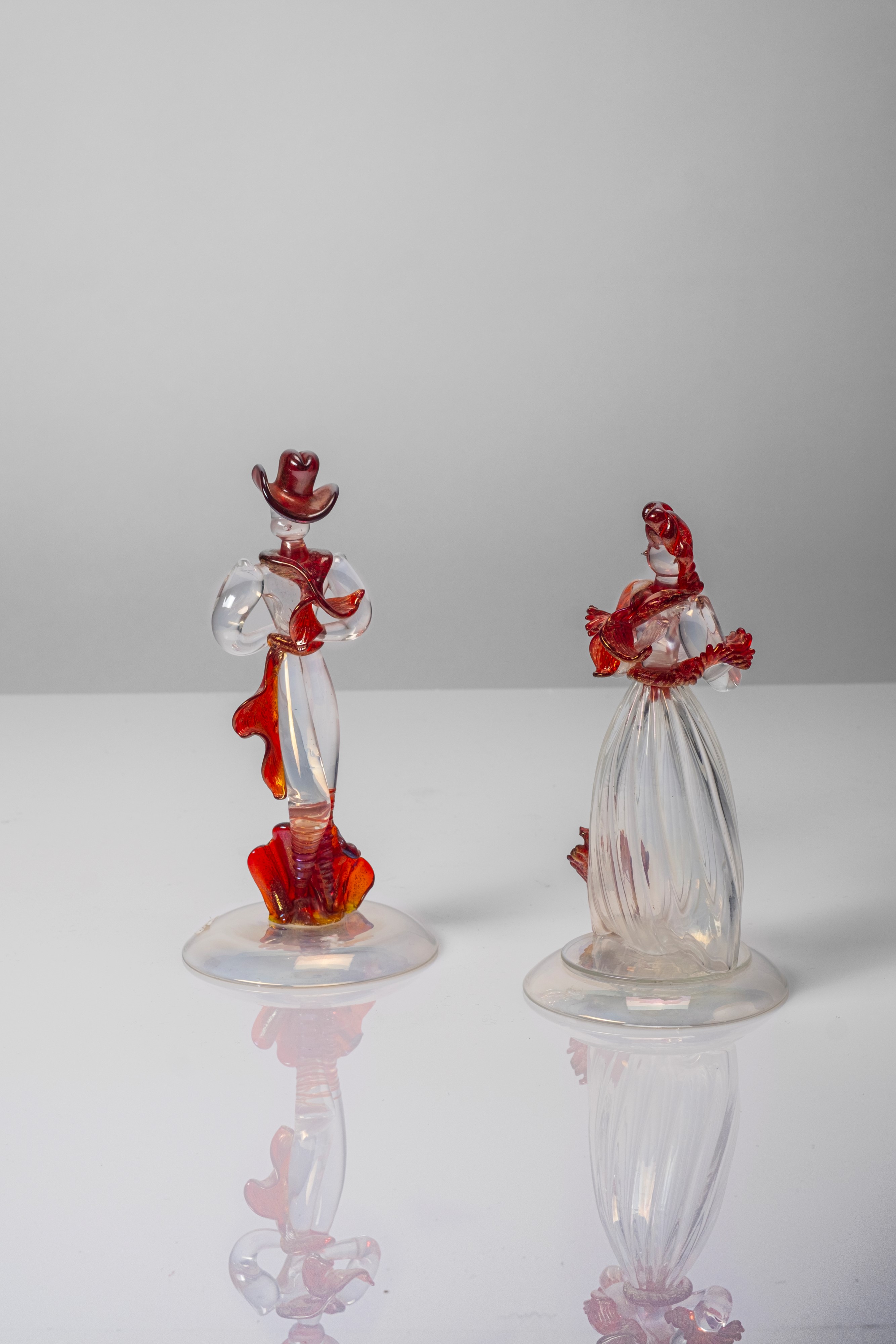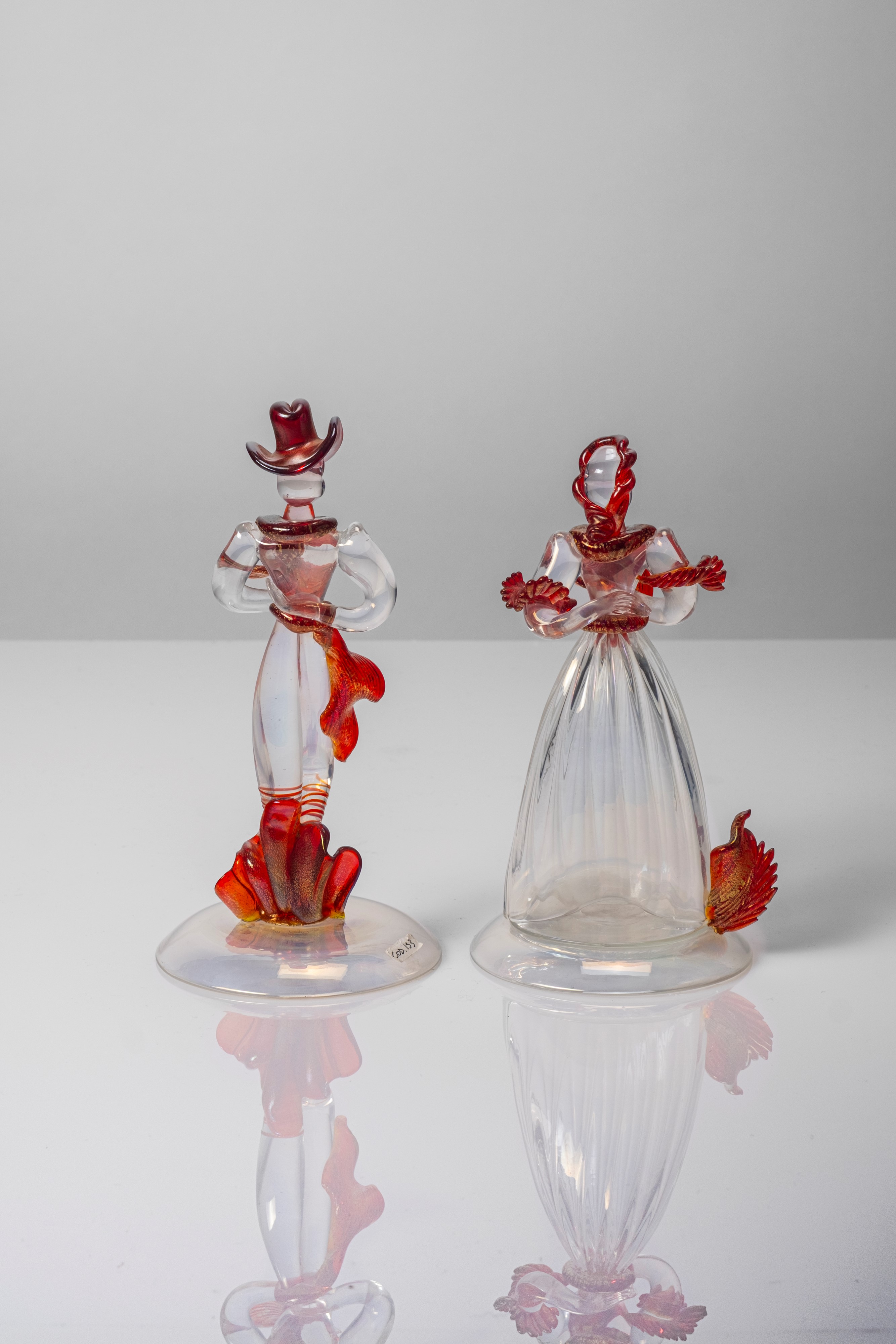 Coppia di figurine Dama e gentiluomo in vetro incolore con dettagli in vetro rosso con decoro a foglia d'oro