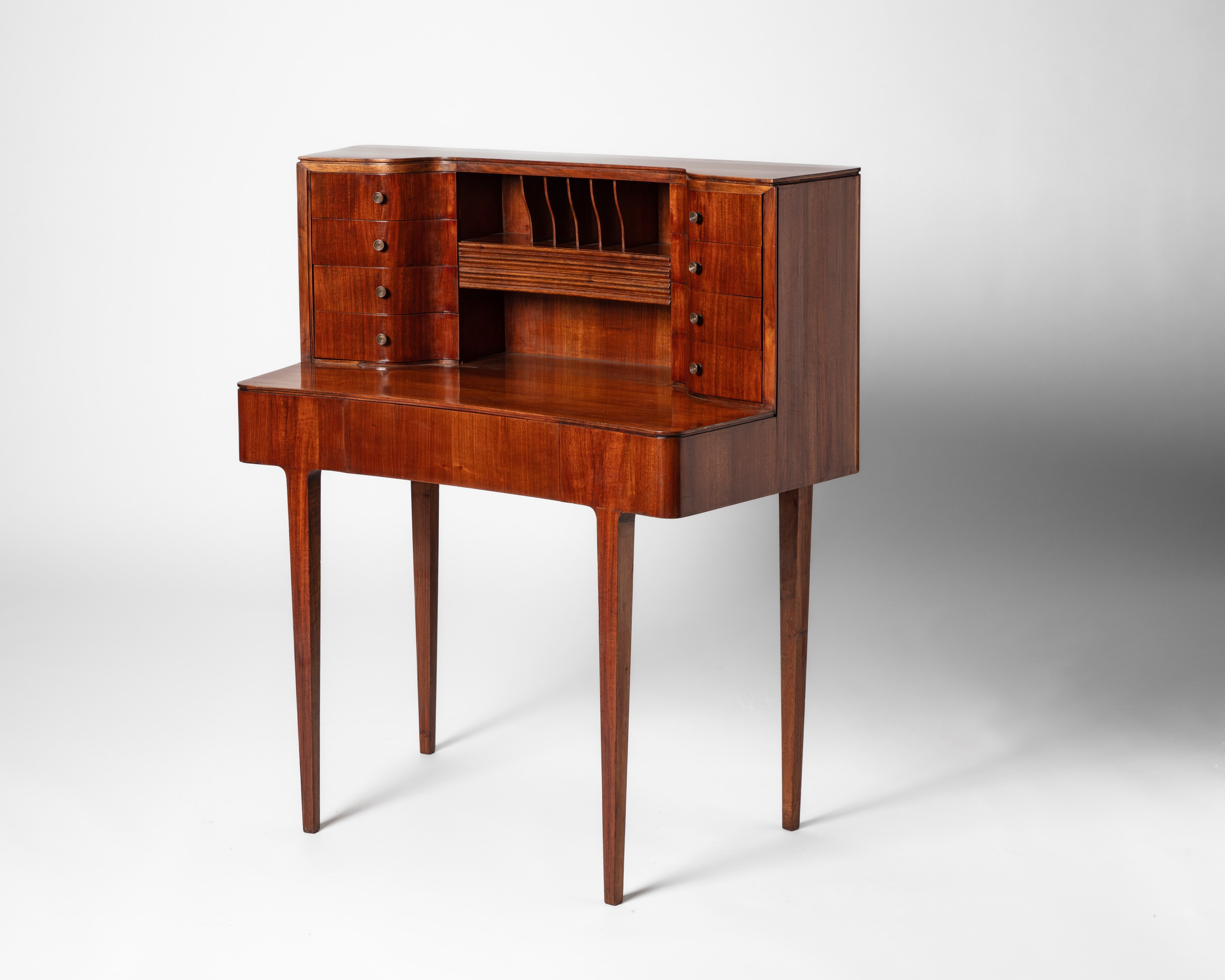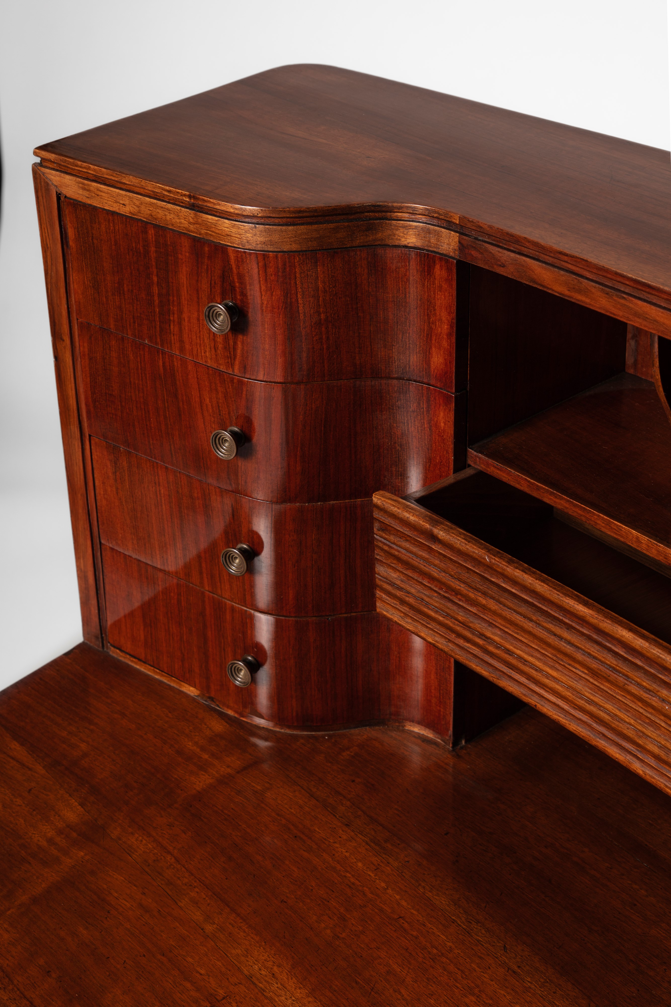 Elegante secrétaire da centro in legno impiallaciato con cassetti laterali sagomati, cassetto centrale grissinato e dettagli in ottone