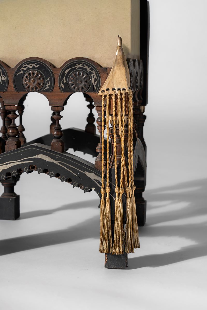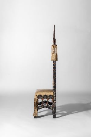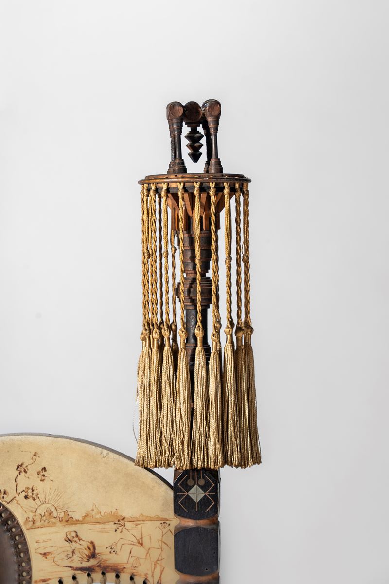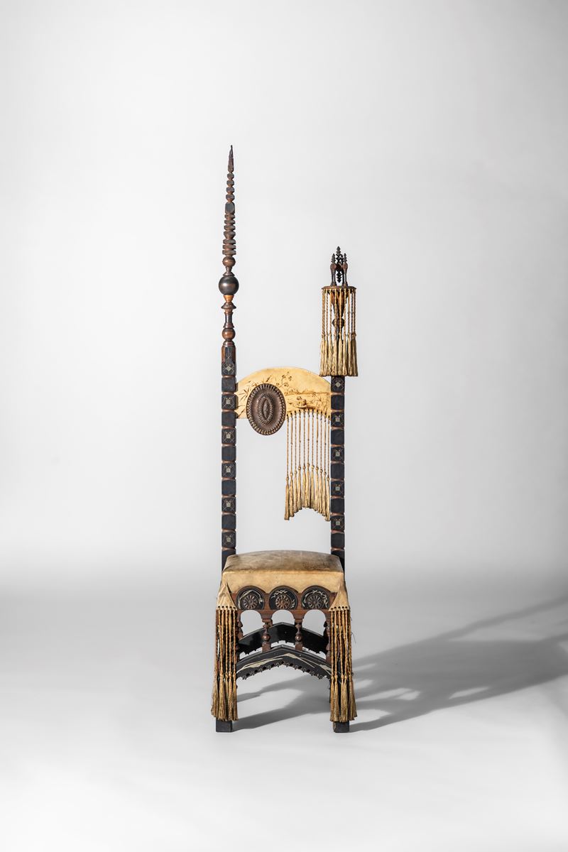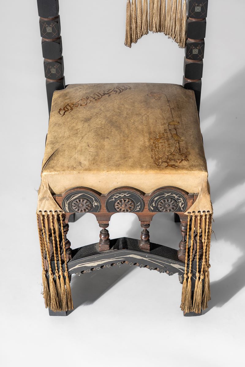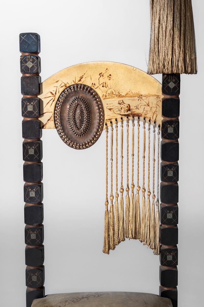 Sedia a spalliera alta ed asimmetrica con struttura lignea riccamente intarsiata in peltro e decorata con elementi in osso e rame sbalzato; frange in passamaneria e rivestimenti in pergamena e pelle dipinta