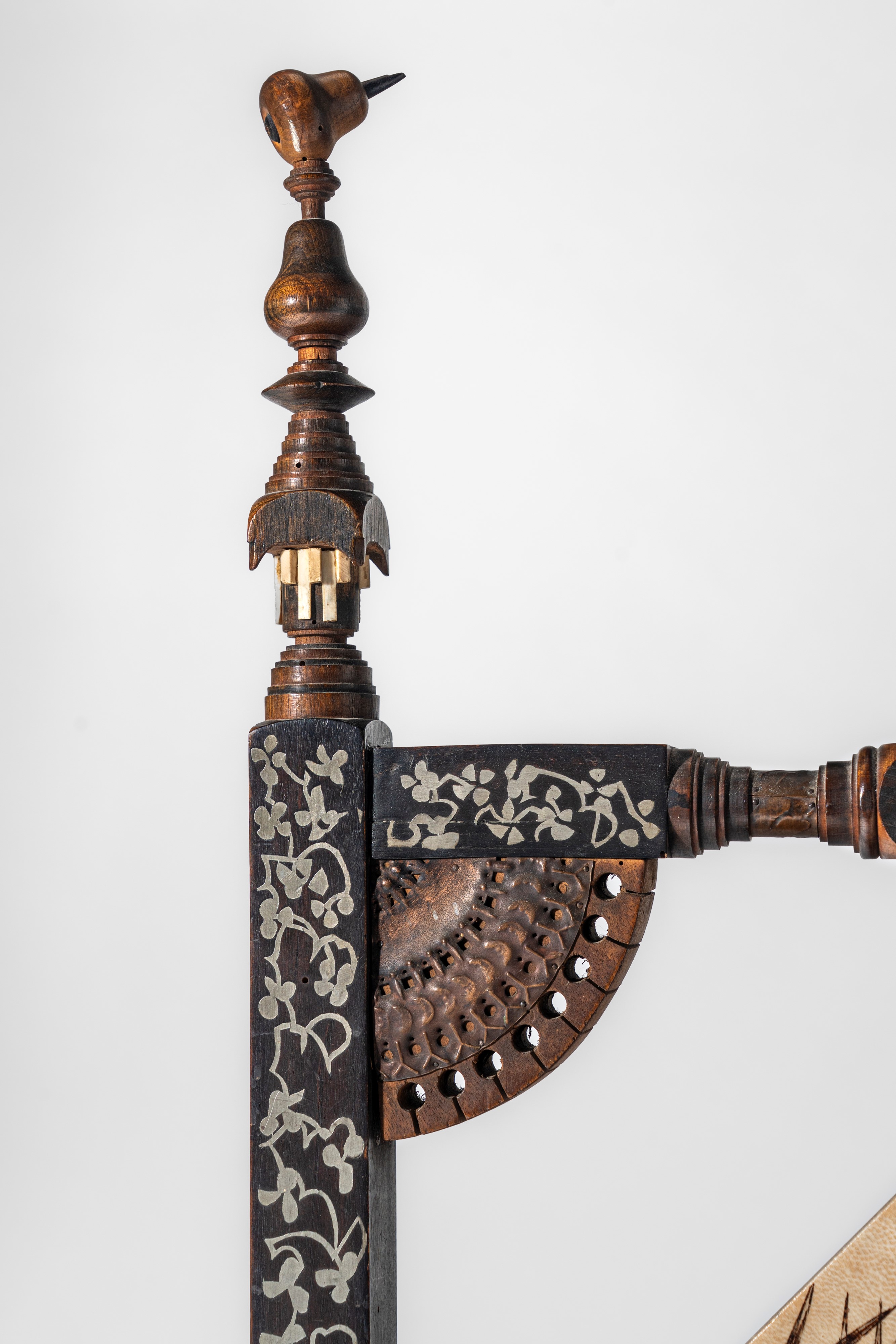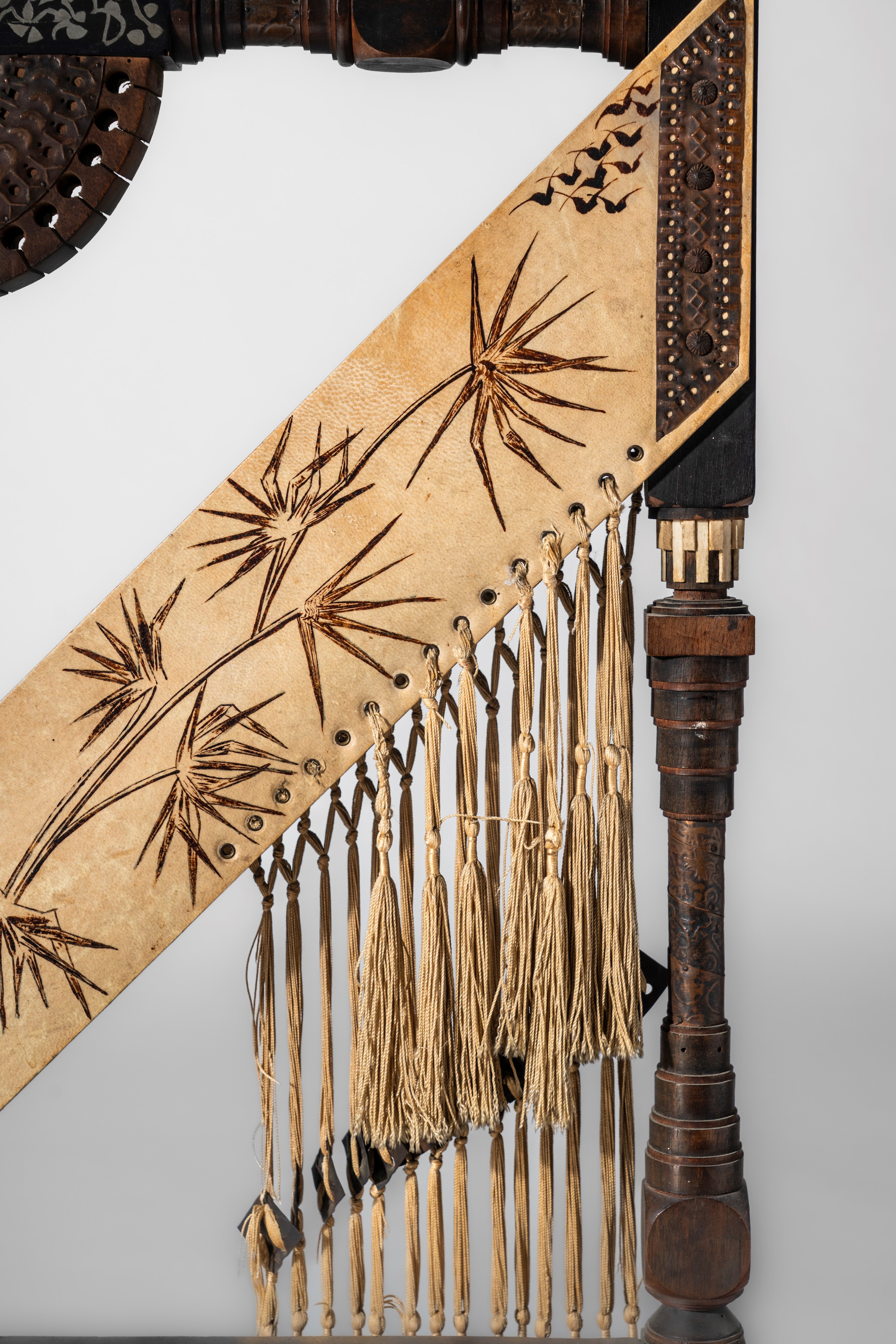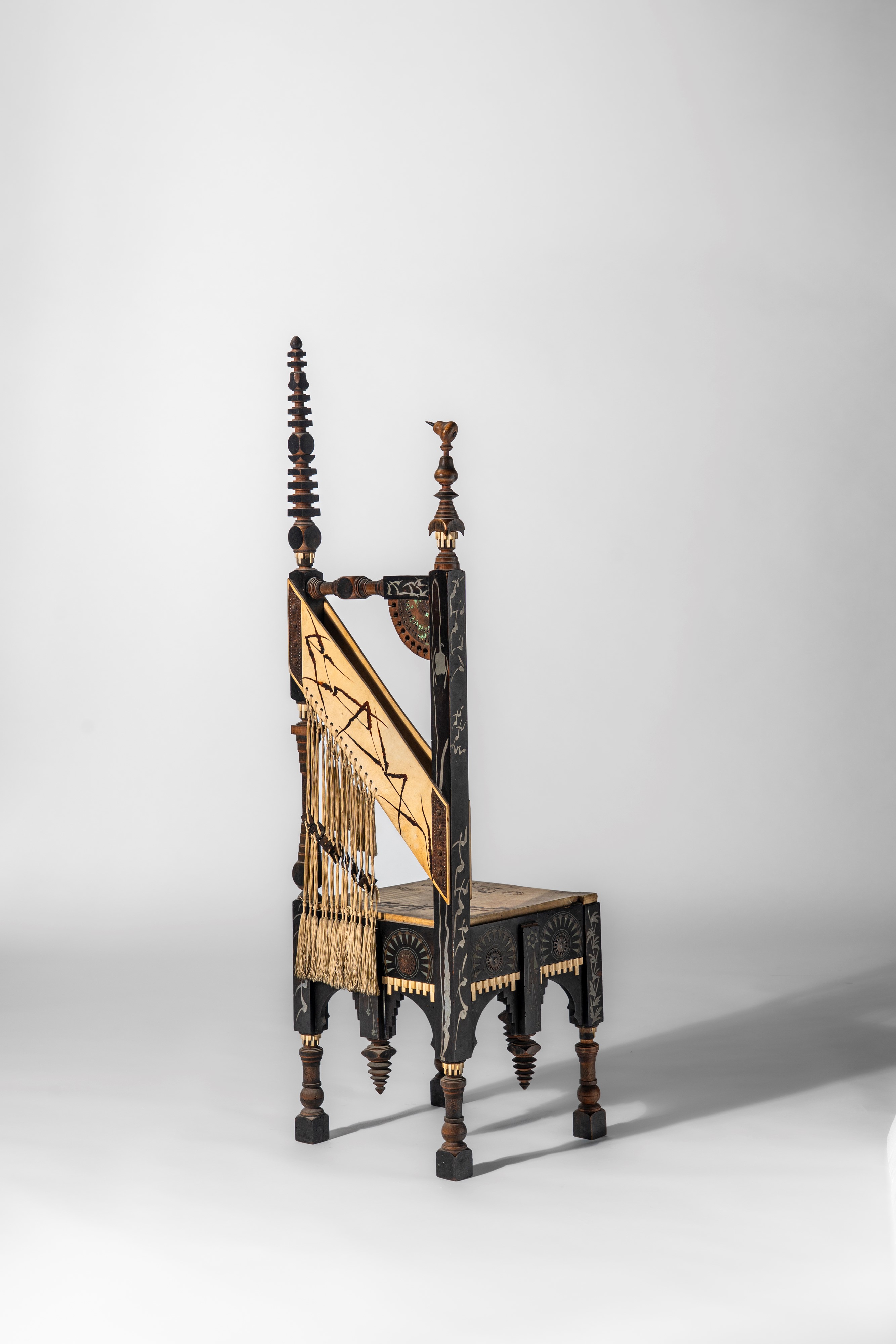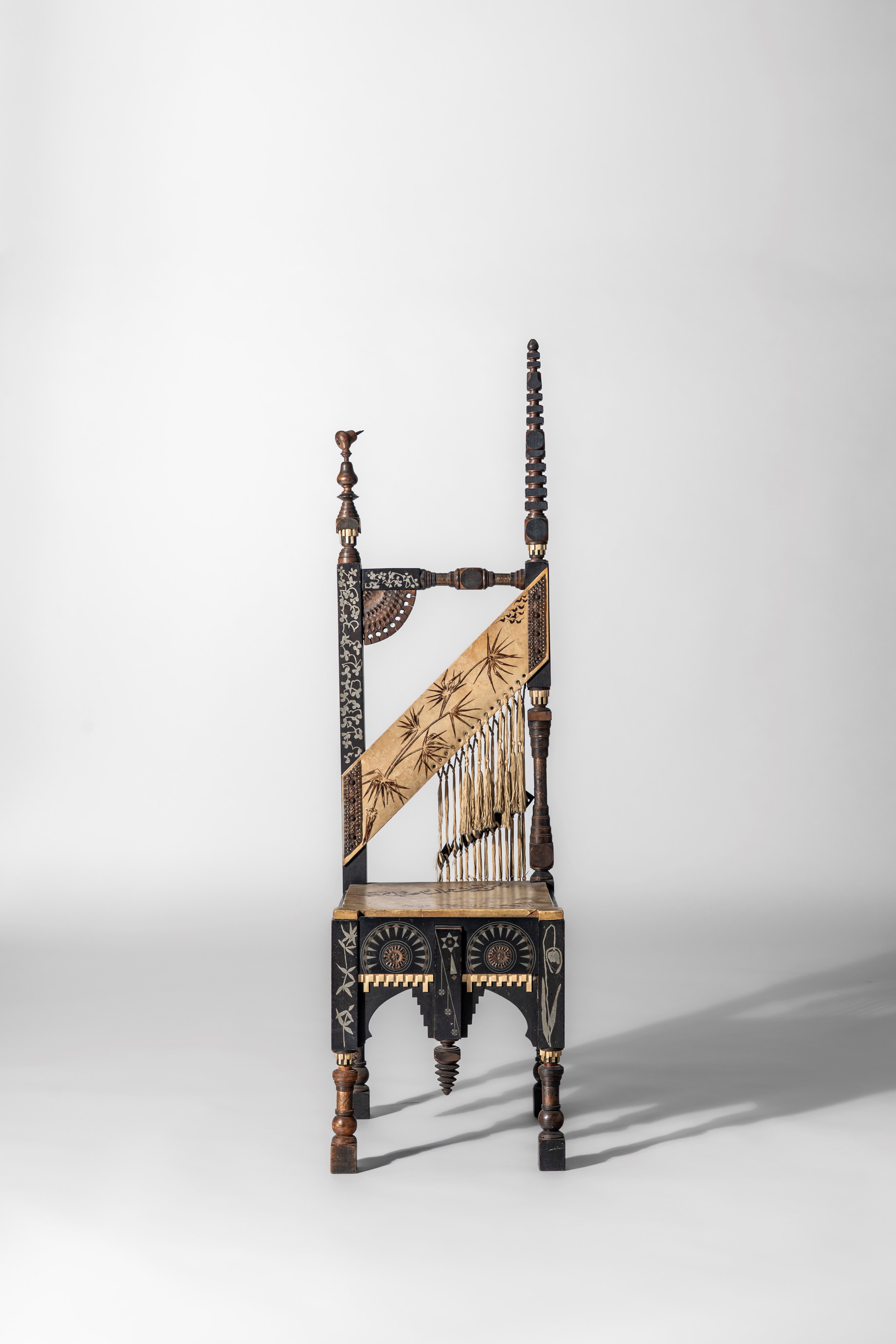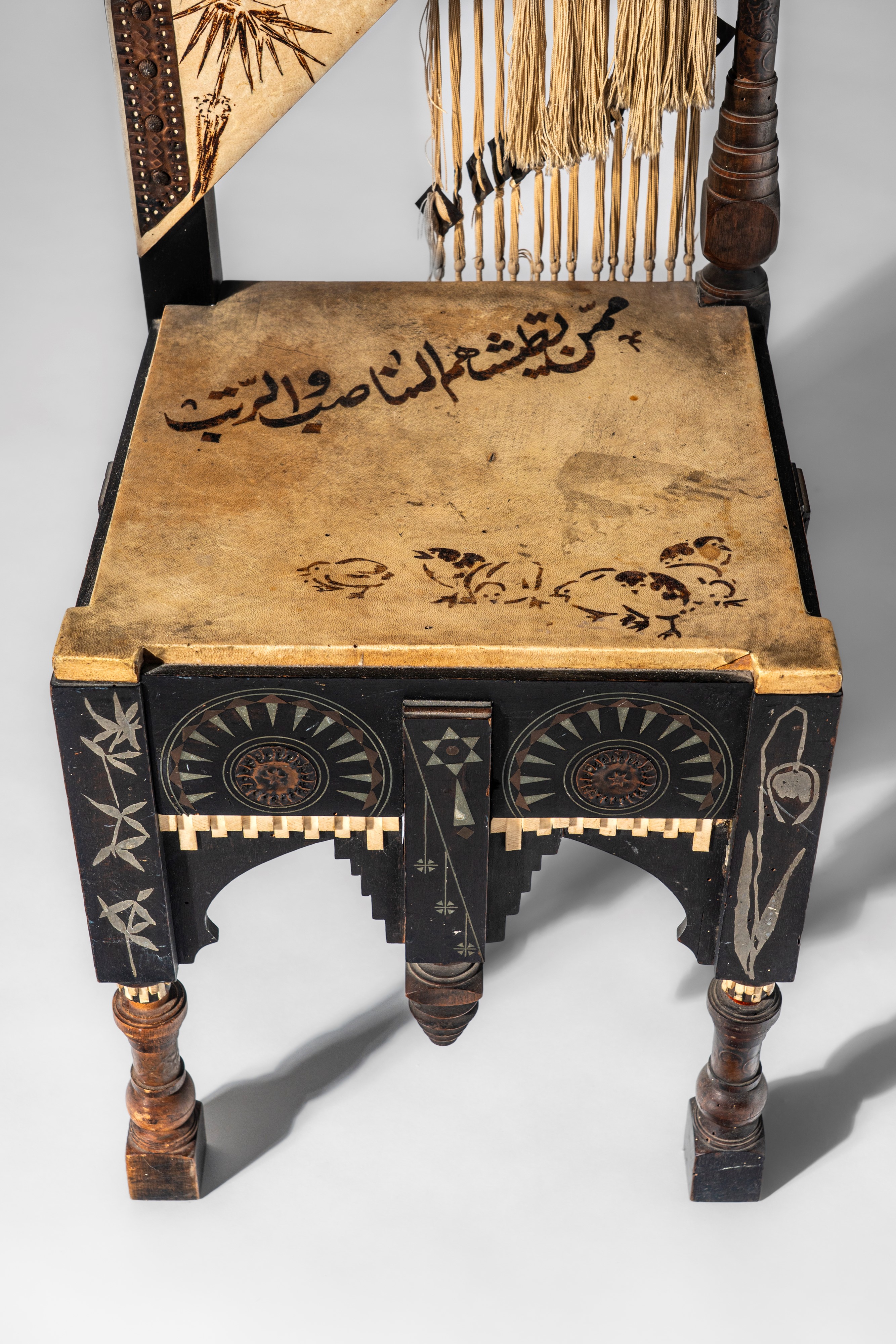 Sedia a spalliera alta ed asimmetrica con struttura lignea riccamente intarsiata in peltro e decorata con elementi in osso e rame sbalzato; frange in passamaneria e rivestimenti in pergamena dipinta