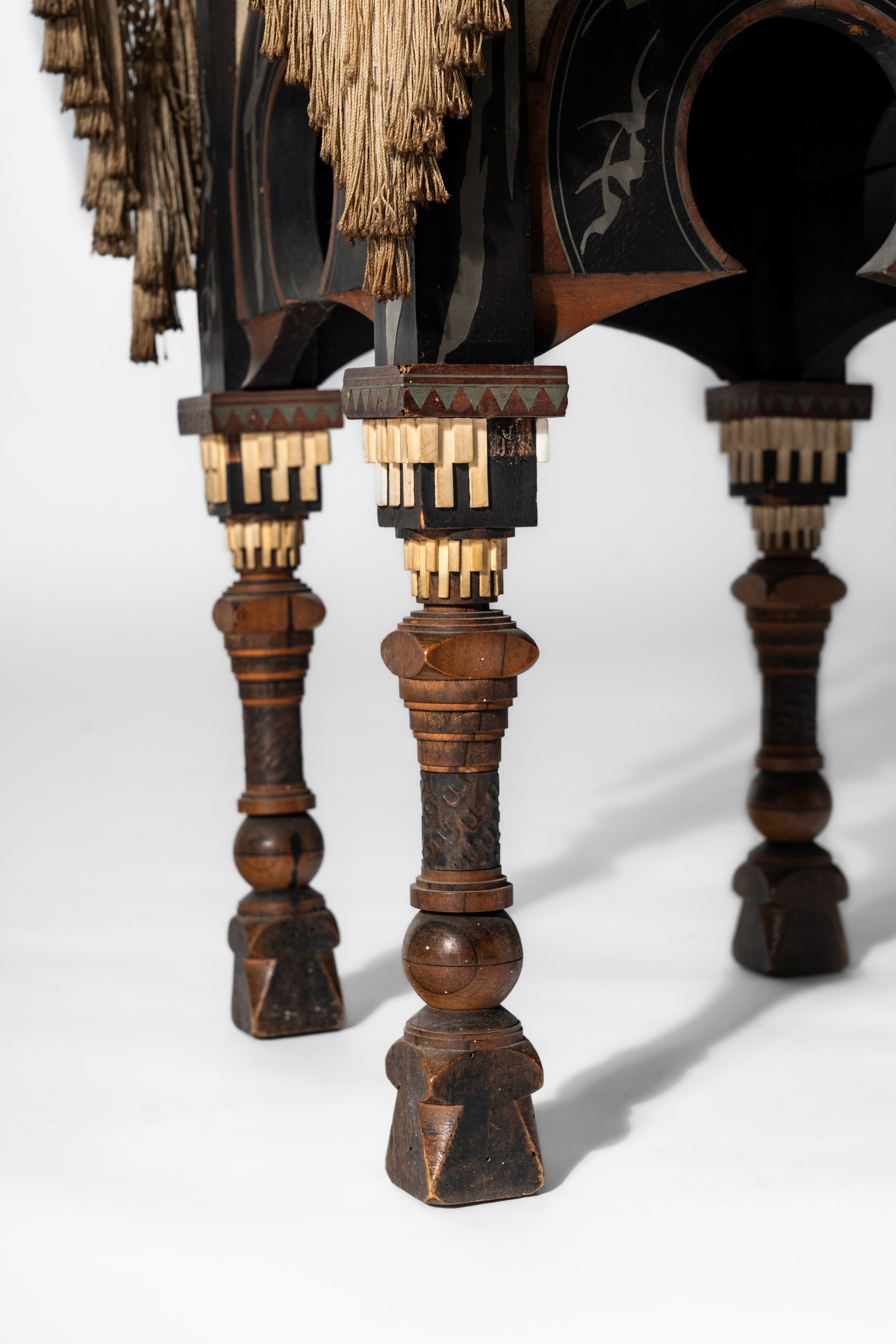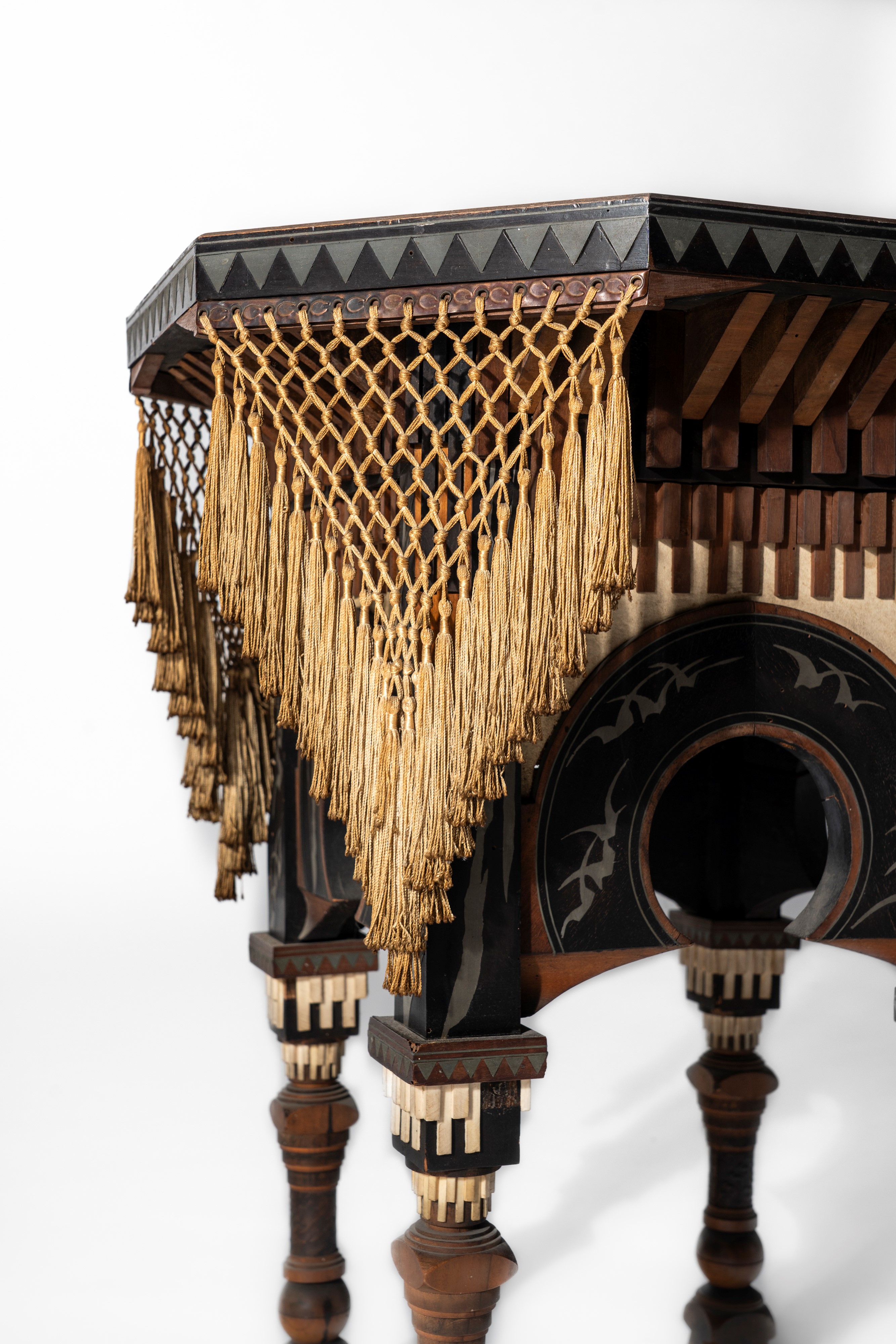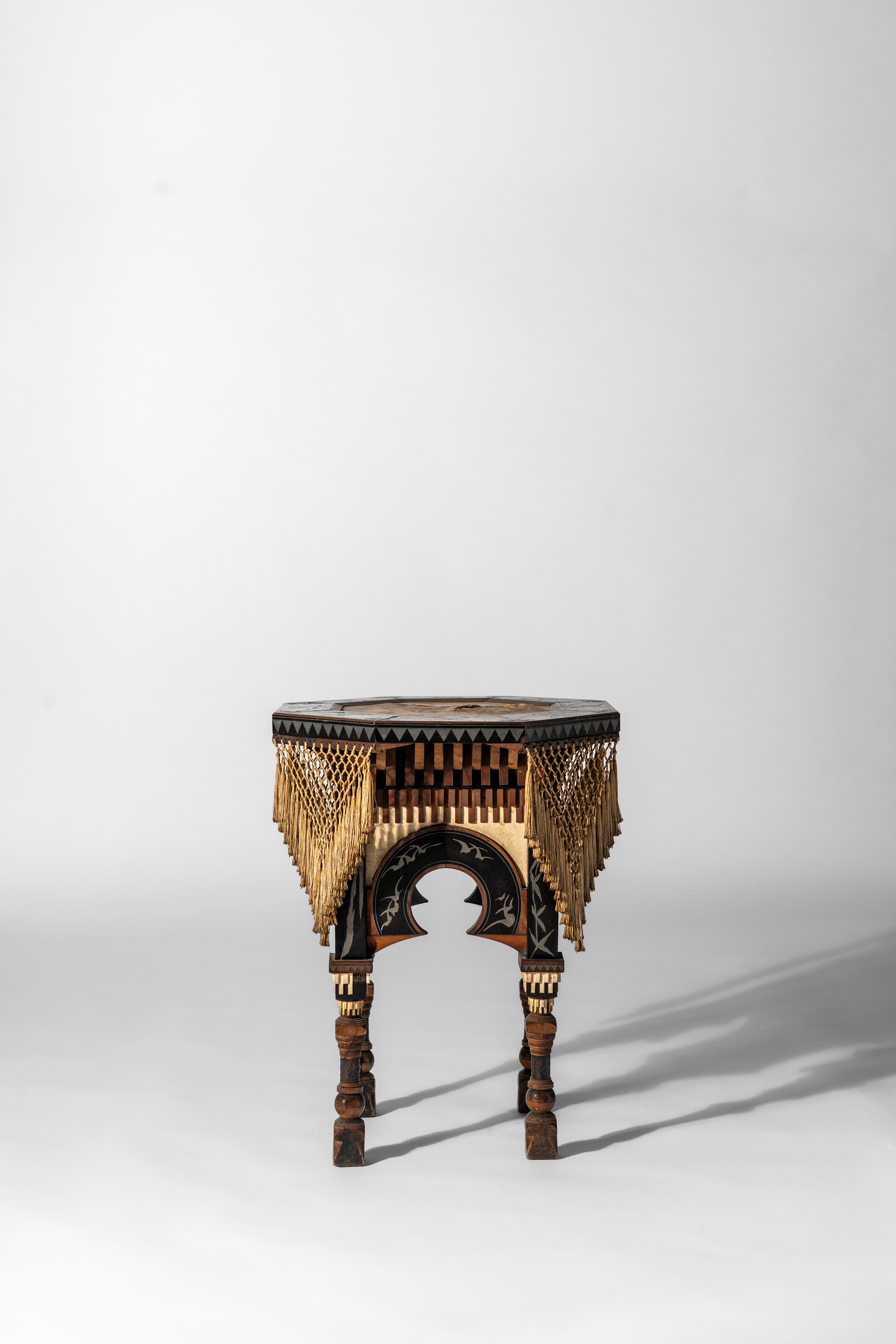 Tavolino con piano ottagonale e rivestimento in pergamena dipinta, frange in passamaneria, struttura lignea intarsiata in peltro e decorata in osso e rame