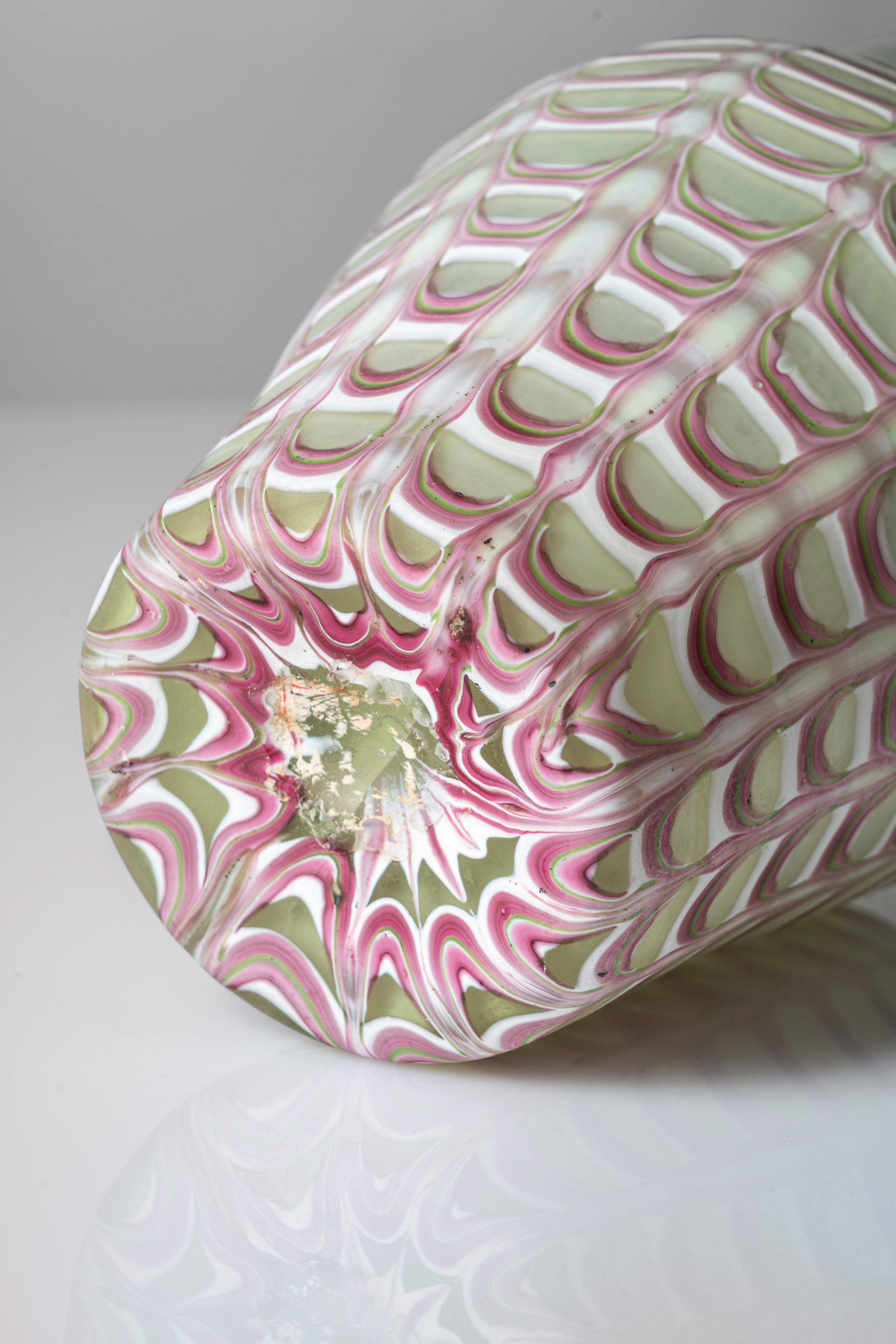 Vaso con decoro fenicio ad anse applicate in vetro incamiciato verde e festonato ametista