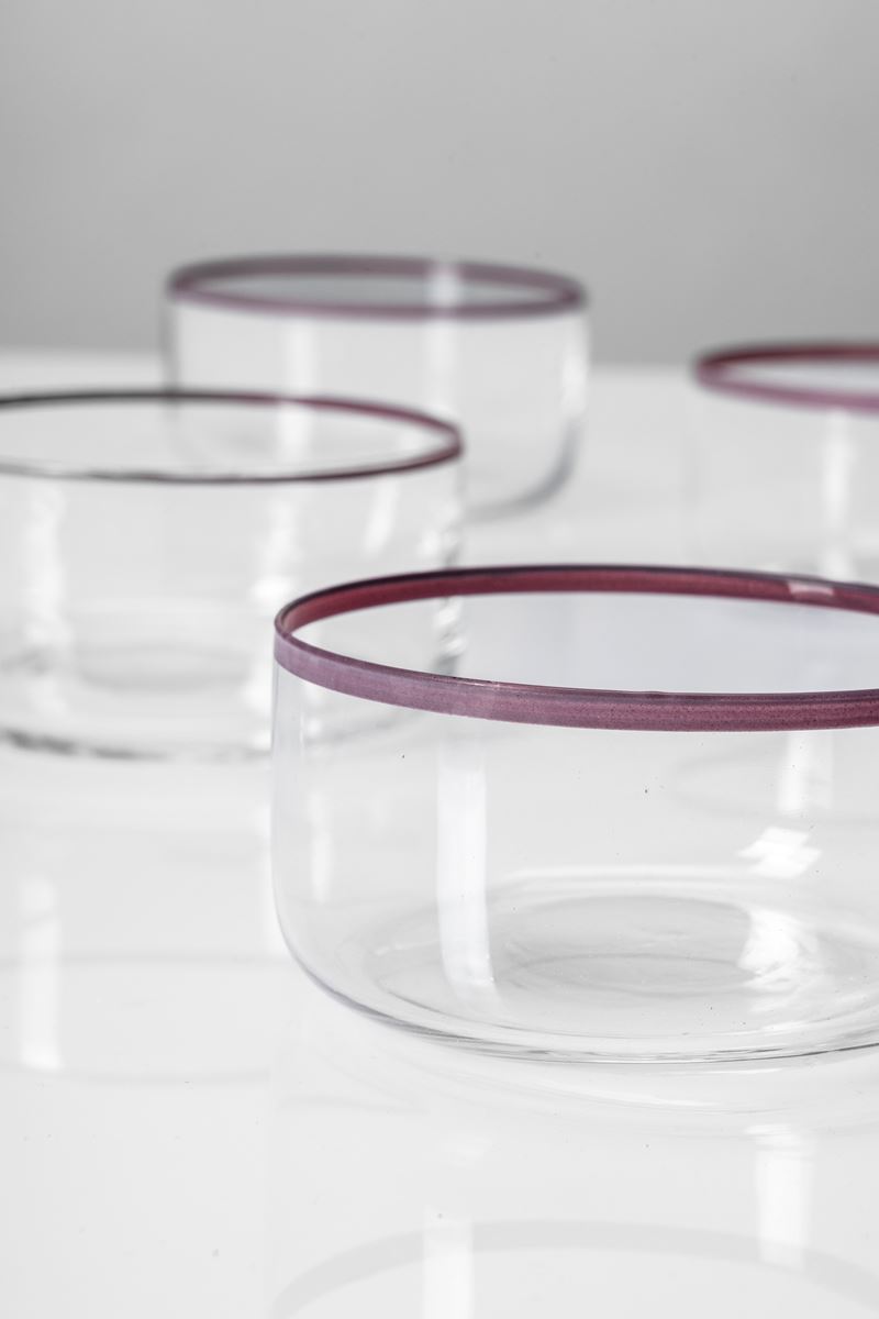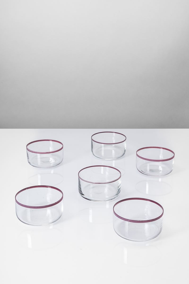 Set di sei coppette in vetro incolore bordate in rosa per Casa PBH, Milano