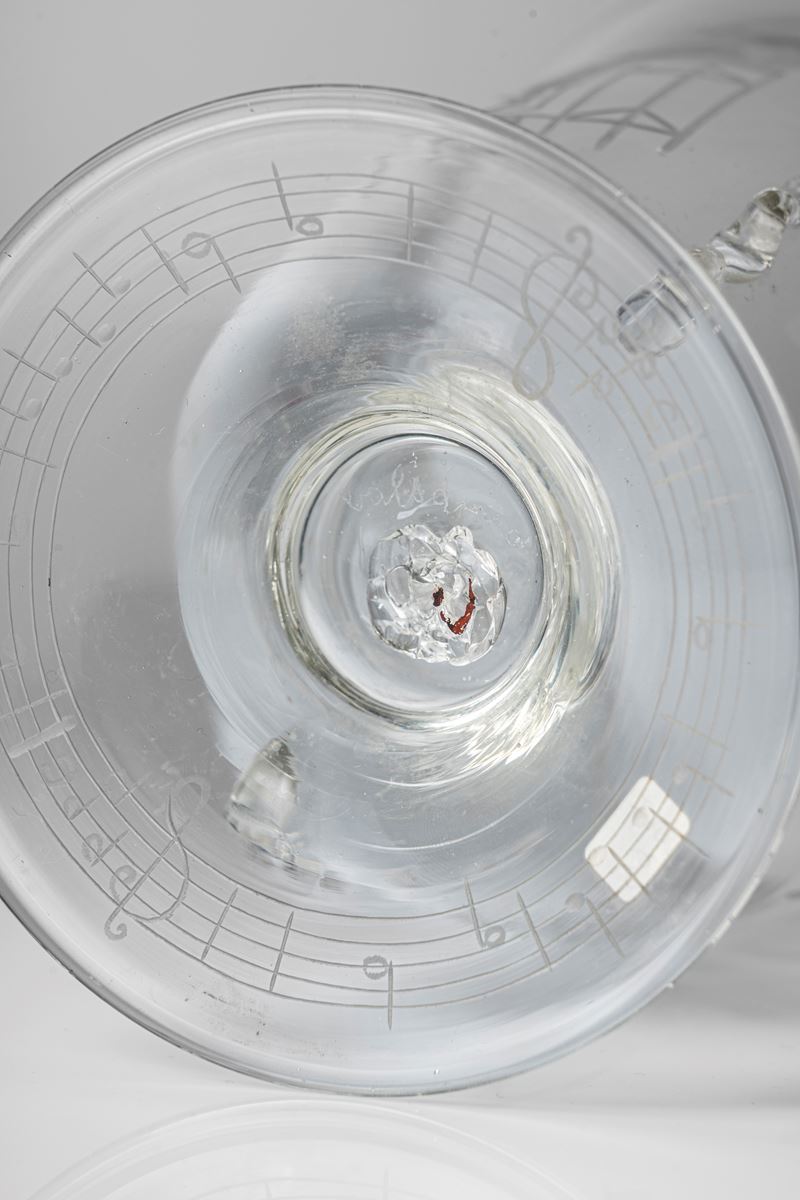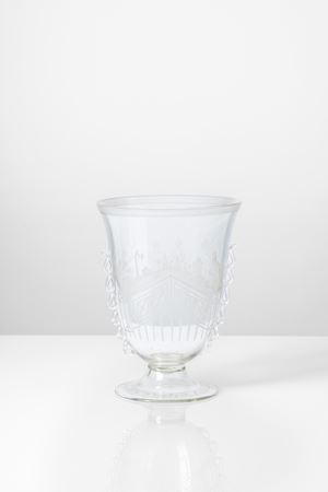 Vaso in vetro incolore con anse laterali applicate e decoro ad incisione a bulino, decoro su disegno di Guido Balsamo Stella