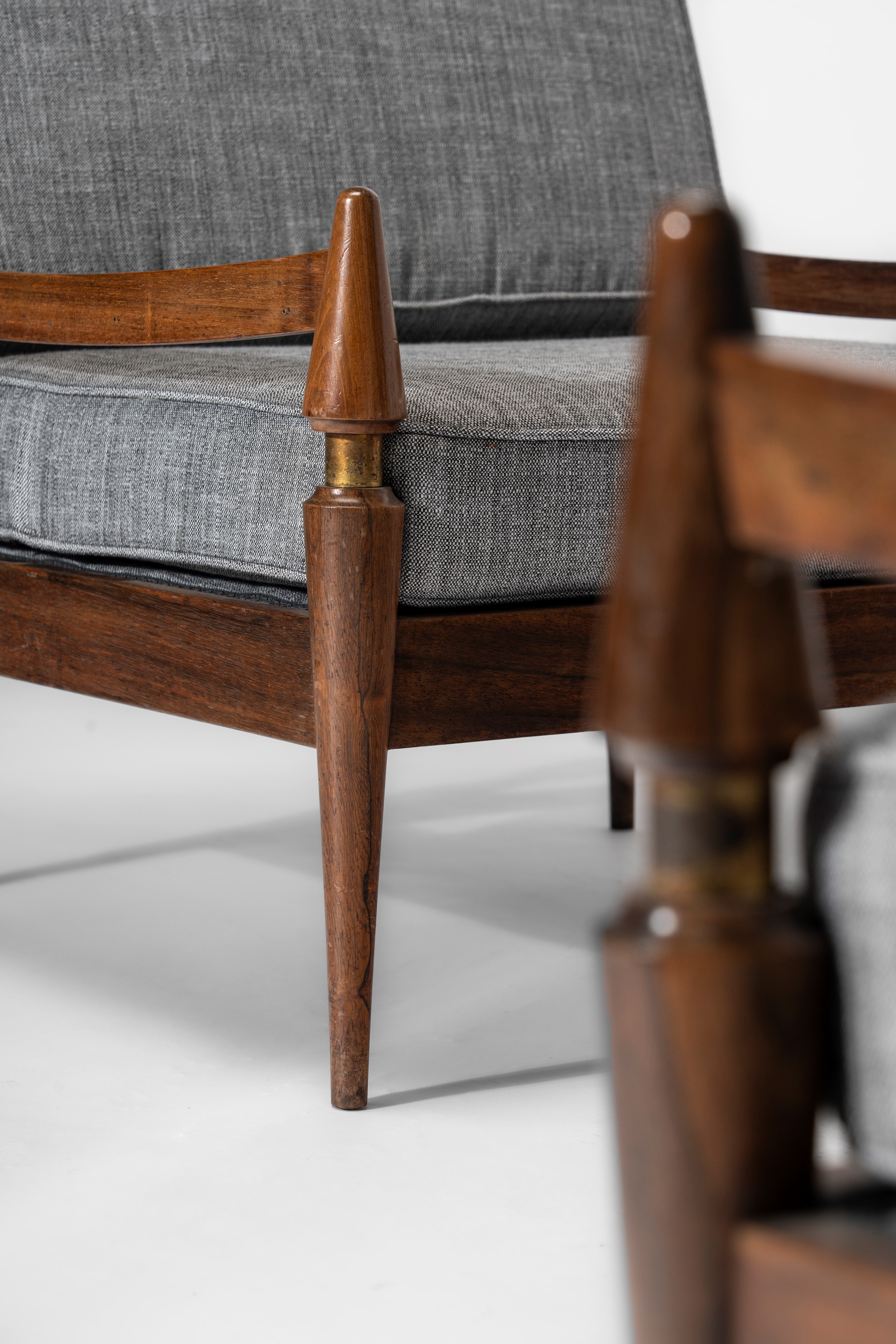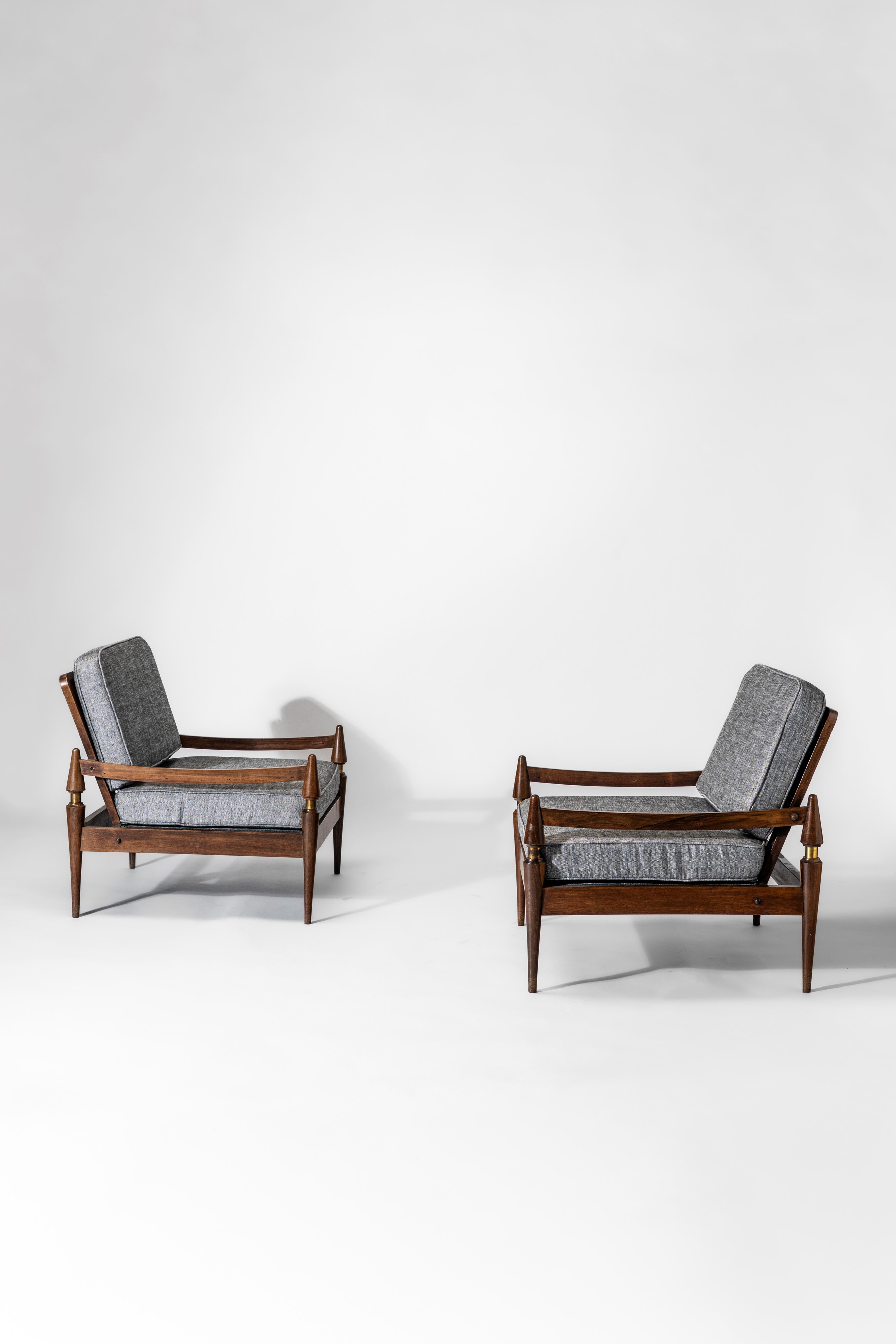 Coppia di poltrone con struttura in legno massello e dettagli in ottone