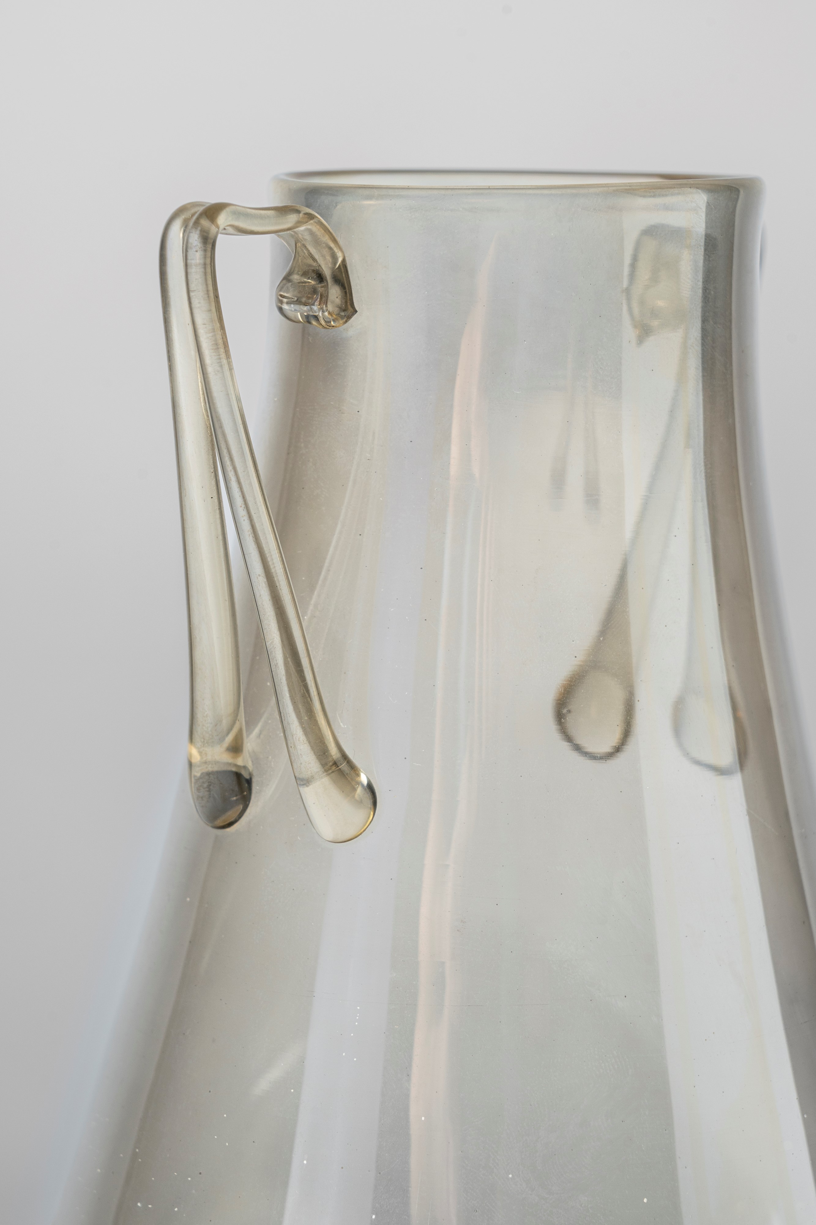 Vaso in vetro soffiato 'pagliesco' leggermente iridato con doppie anse applicate