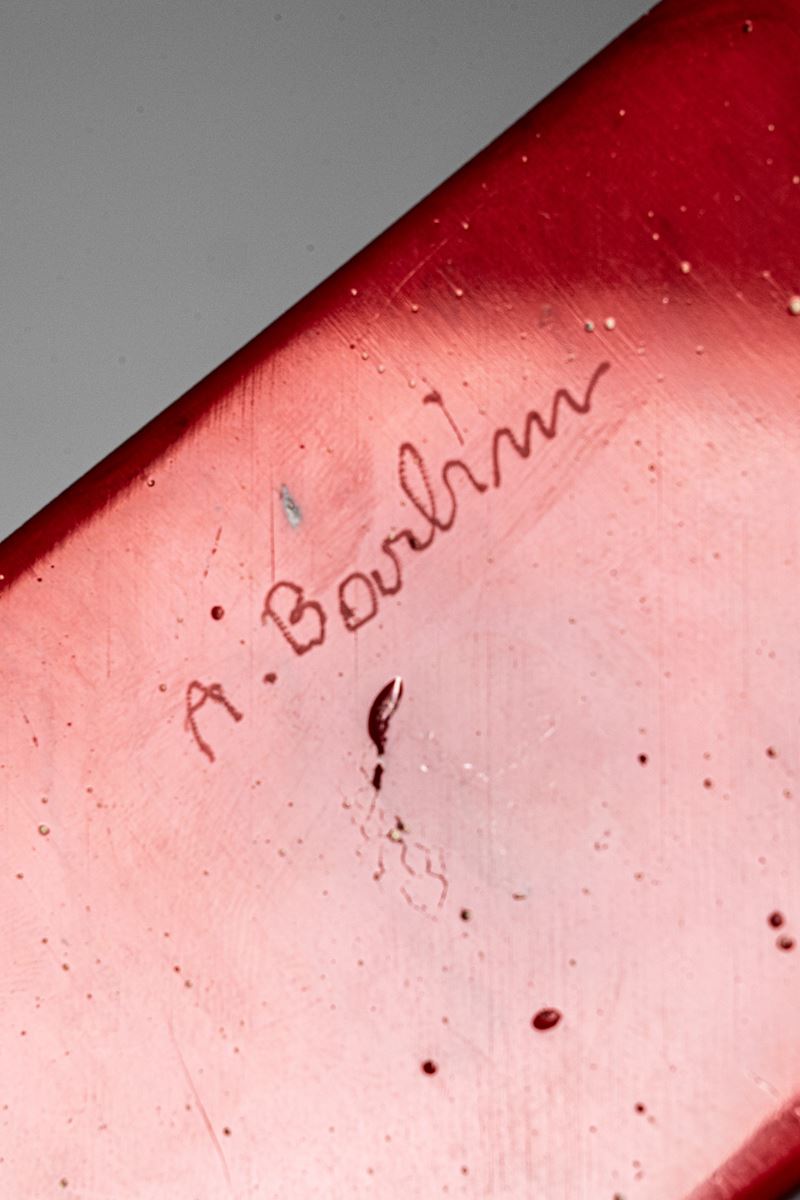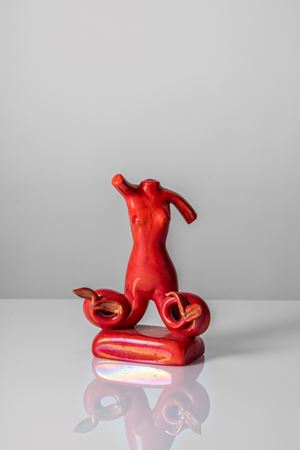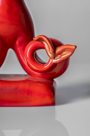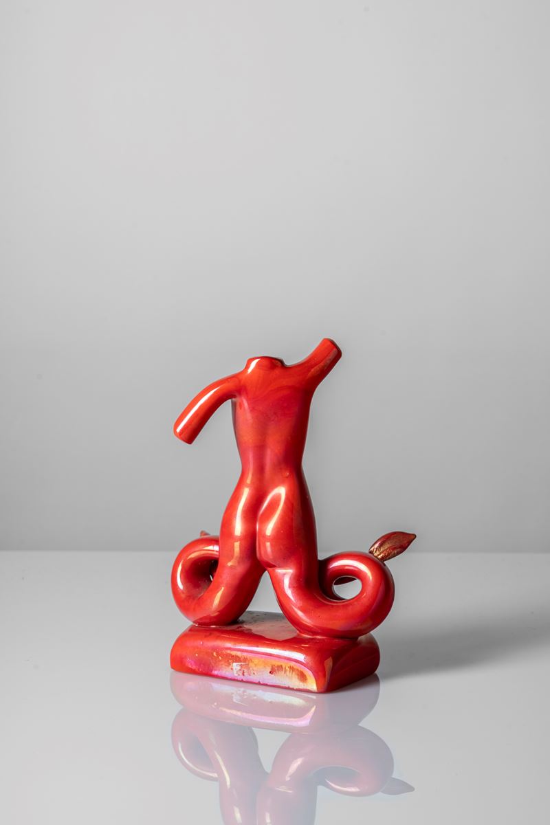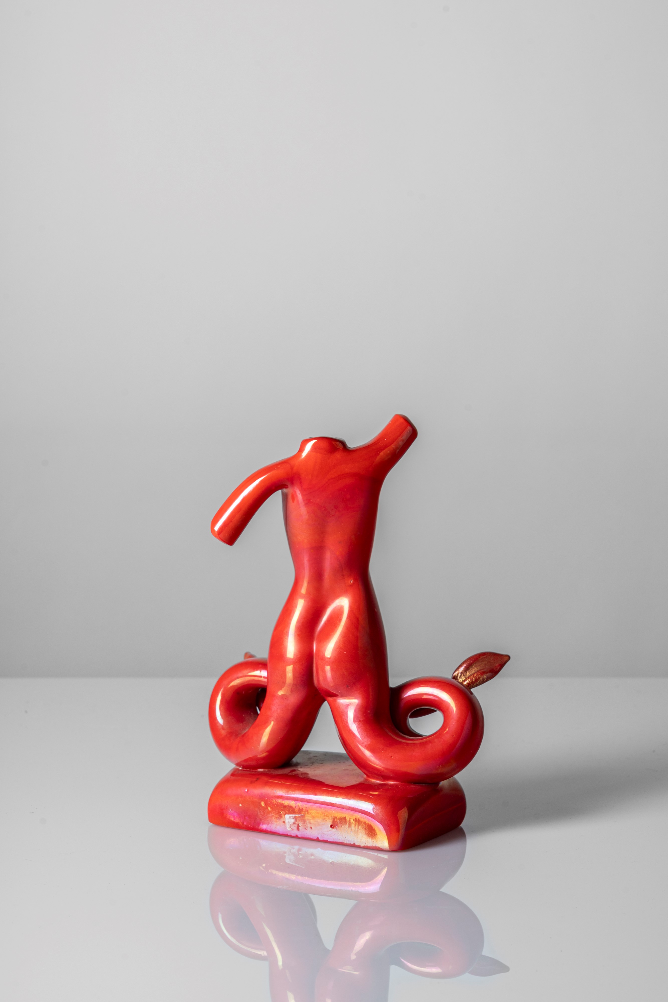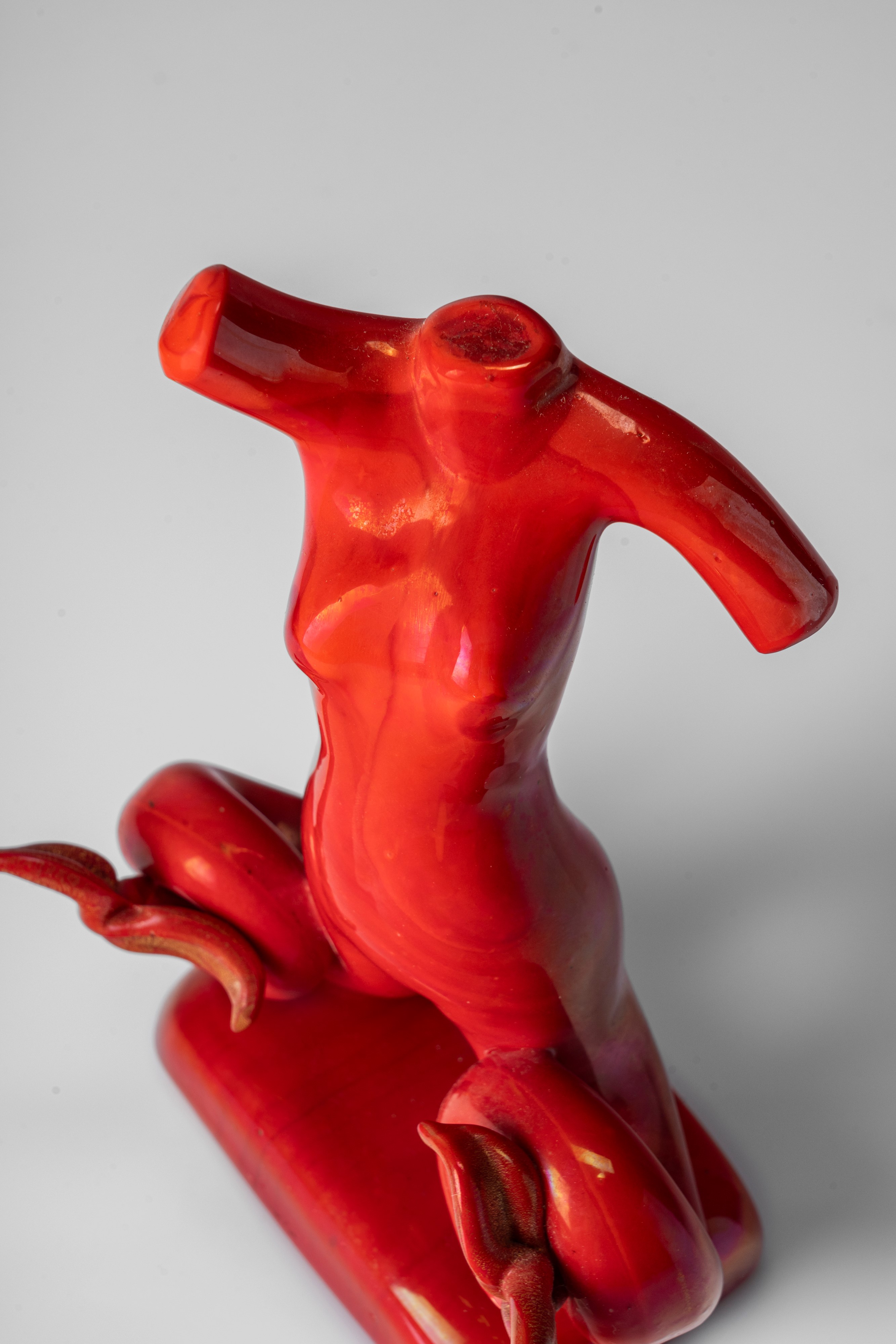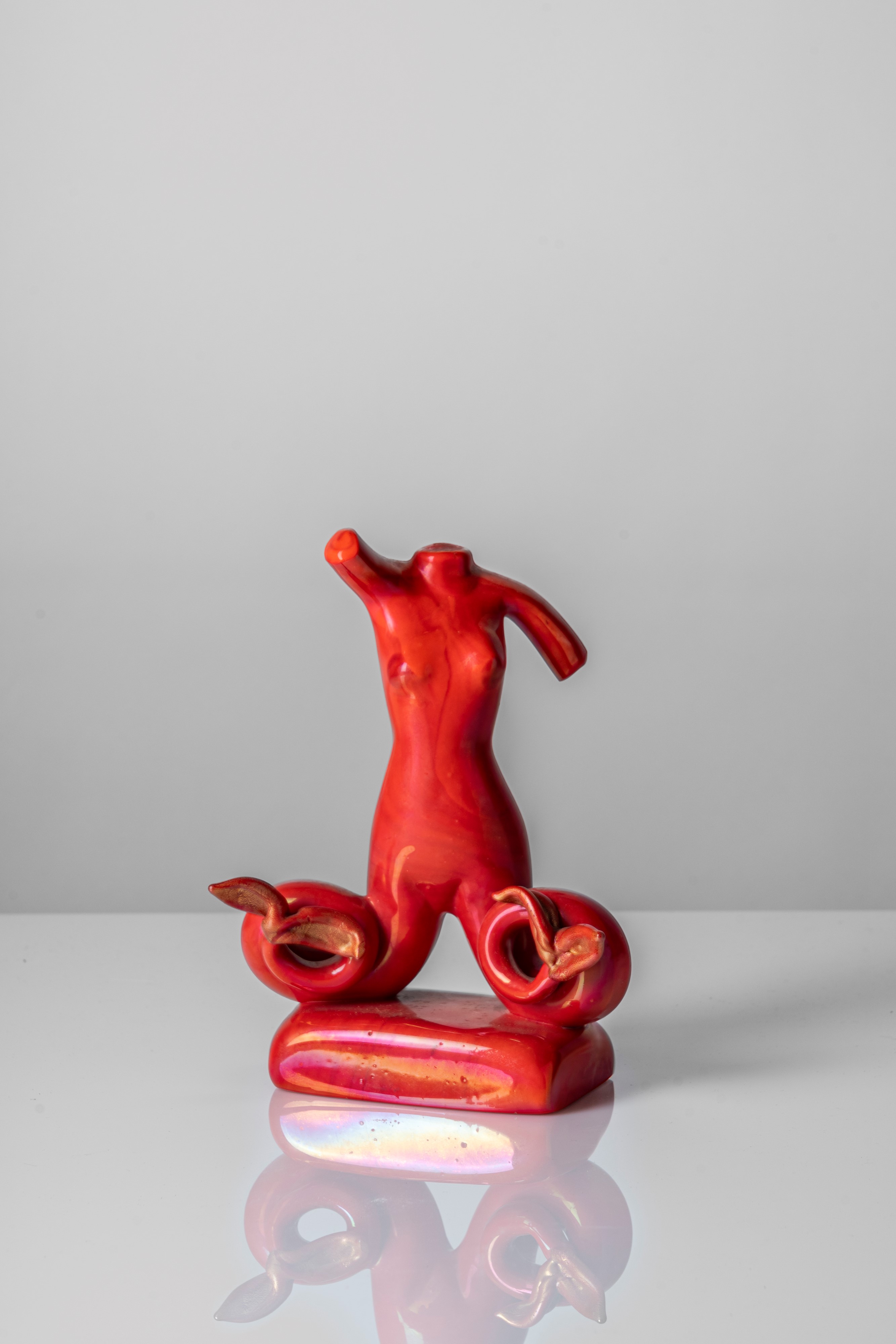 Rara figura di Sirena acefala in pasta di vetro corallo e decoro a foglia oro