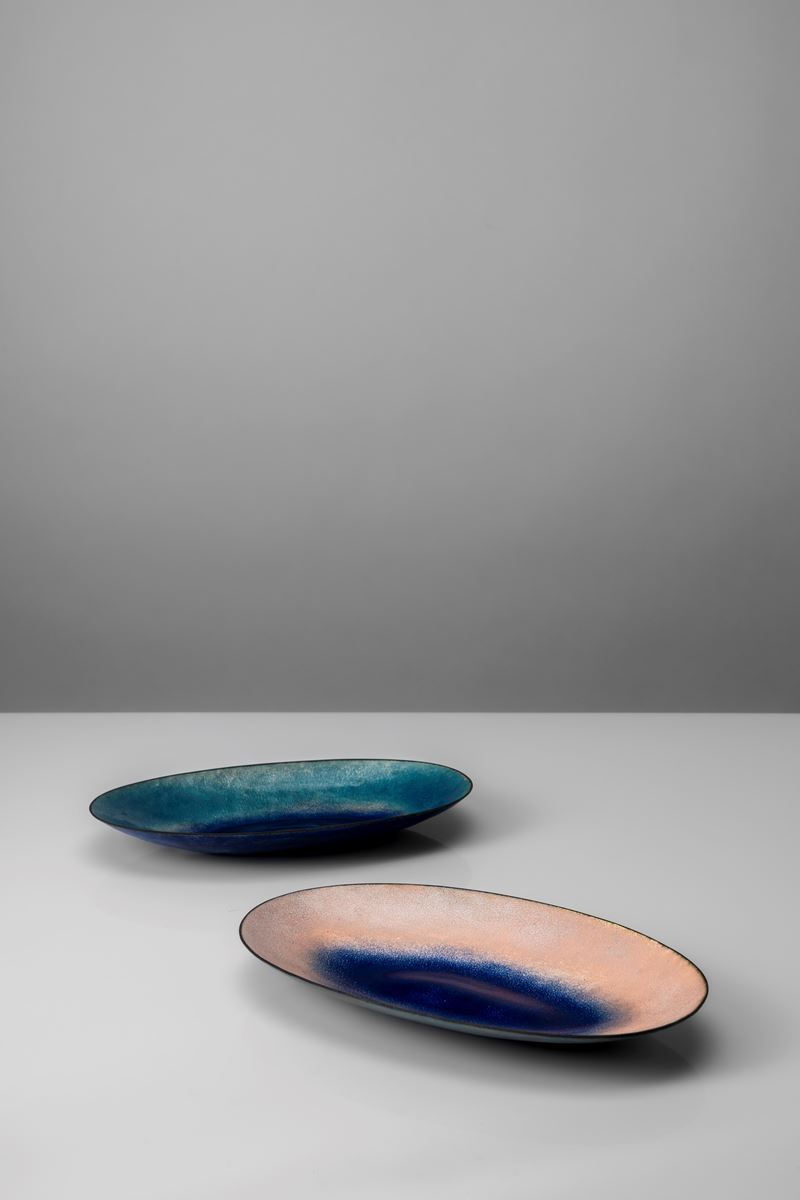 Coppia di vassoi a smalti policromi su rame modello no. 2132