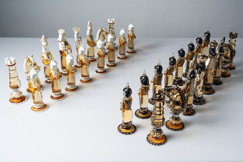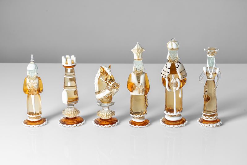 Raro set di scacchi composto da 32 elementi in vetro massiccio color ambra, finiture in pasta di vetro bianca o nera e decoro a foglia oro