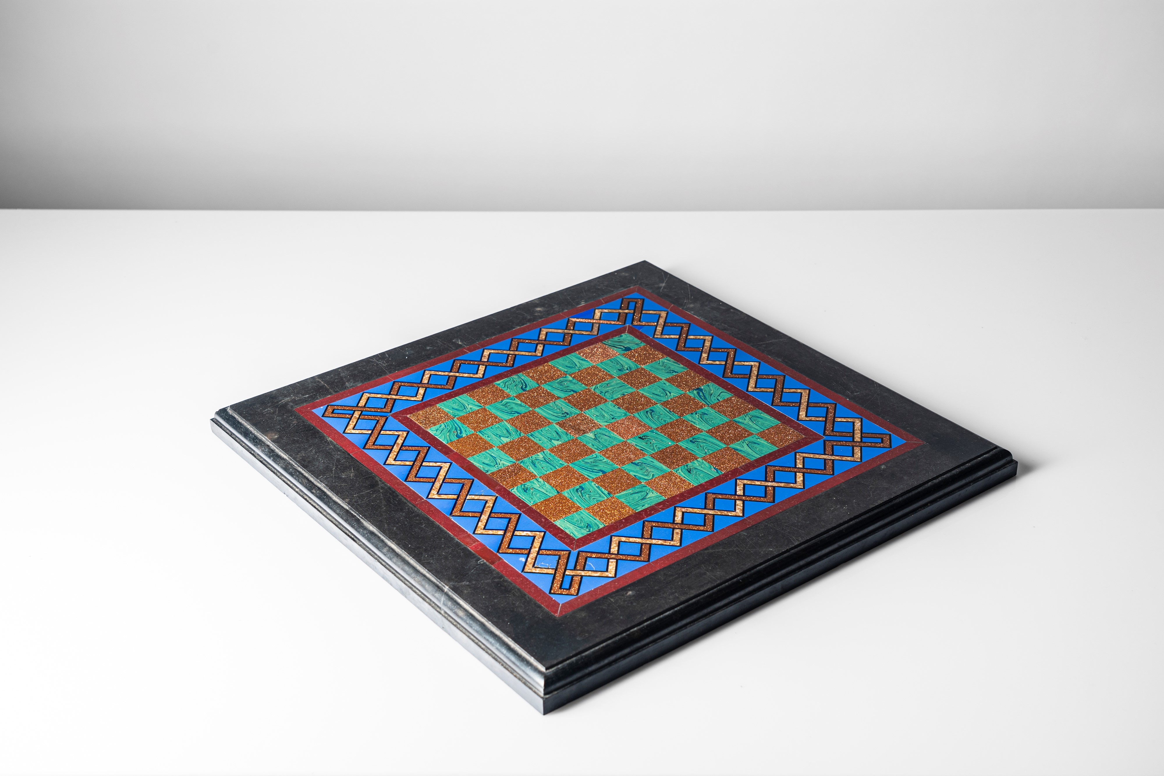 Rara scacchiera su base di ardesia con intarsi in pasta vitrea ad imitazione pietra dura, malachite, marmo, corniola, lapis ed avventurina