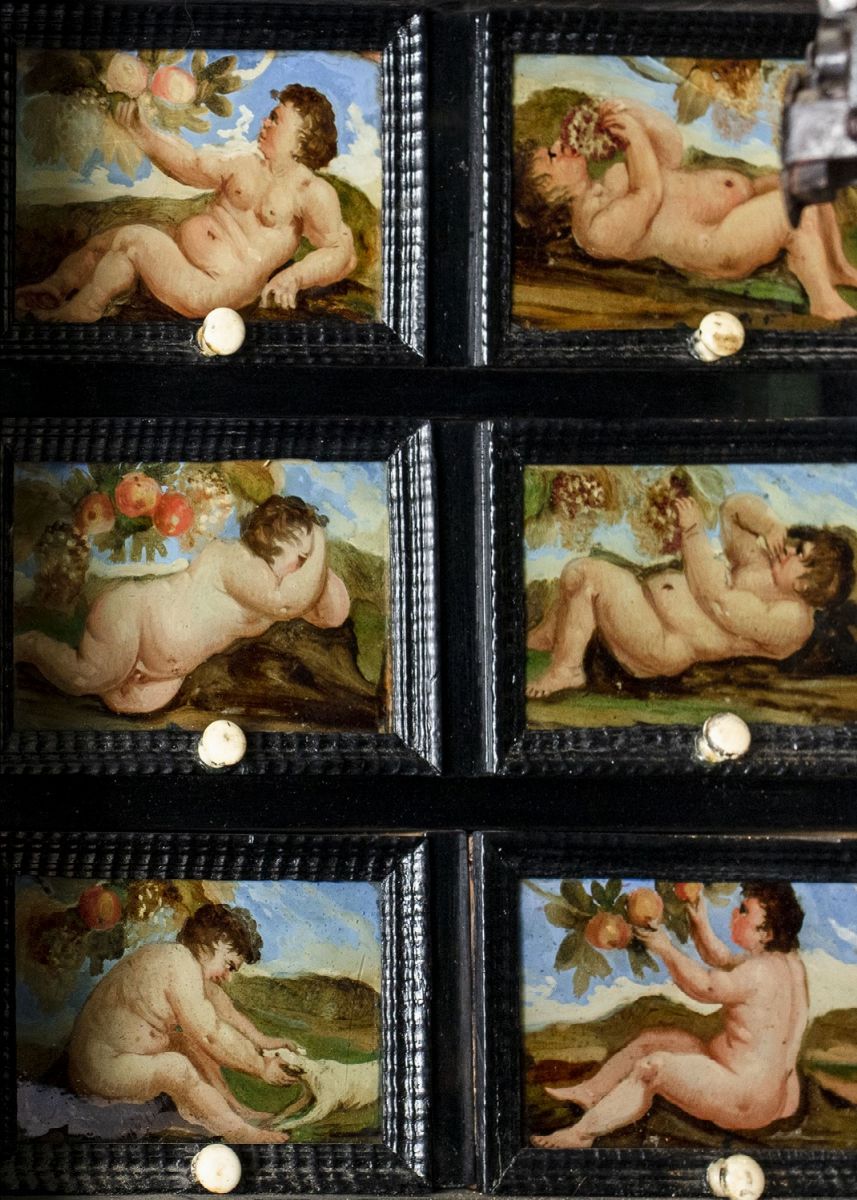 Lo stipo, decorato con 26 placche esterne, contornate da cornici a motivo guilloché, dipinte su vetro con scene di soggetto mitologico, figure allegoriche e putti, testimonia un gusto invalso nelle dimore patrizie di custodire, meraviglie, monete, oggetti preziosi. Mobile di rappresentanza, il cabinet nasce da un interesse per il collezionismo che partendo dal microcosmo dello studiolo si trasforma, con lo scorrere del tempo, in galleria, per diventare poi Wunderkammer. Sono numerosi gli esempi noti di stipi ascrivibili alla bottega di Luca Giordano, dal cabinet di Palazzo Pitti a quello di Dubrovnik, in cui i vetri decorati, come nel caso delle nostre placche, raffigurano soggetti tratti tutti dal repertorio mitologico (Civiltà del Seicento a Napoli, II, catalogo, Napoli 1984, pp. 372-375).