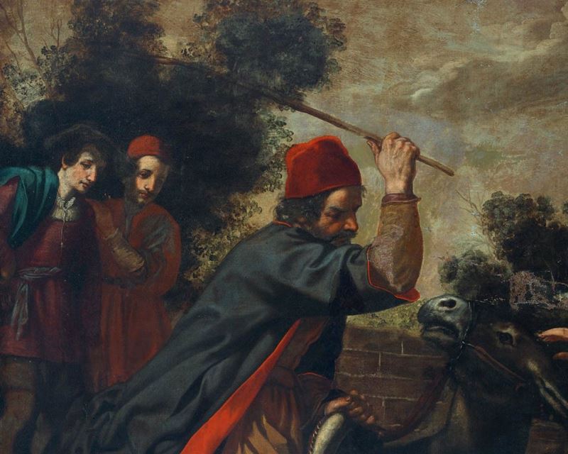 Questo importante dipinto fiorentino raffigurante l’episodio veterotestamentario dell’Asina di Balaam e l’Angelo, è da attribuirsi a Jacopo Vignali, come ci conferma il prof. Sandro Bellesi, cui siamo grati per l’autorevole parere. Ci troviamo di fronte a una versione, di qualità pittorica decisamente alta, che Vignali dovette replicare almeno altre due volte. Un esemplare con la medesima composizione, di dimensioni inferiori, già presente in collezione privata fiorentina e proveniente dal mercato antiquario di New York, fu stimato da Federico Zeri come autografo. Un’ulteriore replica si trovava originariamente nella Villa Gerini a Sesto Fiorentino, già di proprietà della Cariprato, in seguito acquisita nella raccolta della Banca Popolare di Vicenza, dove attualmente si conserva. La scena qui rappresentata, rara e curiosamente bizzarra, attinge da una fonte biblica densa di mistero e di spiritualità. L’episodio è tratto dal Libro dei Numeri XXII, 1-35, dove si narra come Balak re di Moab, intimorito dalle tribù israelitiche che andavano accampandosi presso il suo territorio inviò propri messi presso l’indovino e profeta Balaam, affinché egli, maledicendo gli Israeliti, ne supportasse l’olocausto, per il quale Balak, da solo, non riteneva avere forze sufficienti. Balaam accolse i messaggeri e ne accettò il pagamento e gli onori, tuttavia Jahveh vietò a Balaam la maledizione contro gli Israeliti, poiché essi costituivano proprio il popolo benedetto. Balak di Moab inviò allora altri messaggeri, più autorevoli e promise a Balaam premi ancora maggiori; quest’ultimo perseverò nel rifiuto, sempre demandando alla volontà di Dio la scelta da farsi. Sorprendentemente Dio, stavolta, gli disse di seguire gli ambasciatori verso Moab, e di seguire i suoi ordini. Balaam sellò allora la propria fedele asina e, accompagnato da due servitori, si mise in viaggio. Ecco che l’Angelo di Dio, brandendo una grande spada, sbarrò la strada al piccolo convoglio. Soltanto l’asinella ebbe la facoltà prodigiosa di poter scorgere l’angelo. Balaam, ignaro, la percosse a più riprese con violenza e l’asina poté solo accovacciarsi sotto le cieche percosse del padrone. A quel punto Dio aprì miracolosamente la bocca dell’animale e l’asina interrogò Balaam sulla sua furia, rammentandogli la sua abituale fedeltà; colta con stupore la straordinarietà del fatto, lo stregone-indovino sembrò calmarsi ed ecco che Dio aprì finalmente gli occhi di Balaam, svelandogli la presenza dell’angelo guerriero (Numeri XXII, 31-33). Balaam giurò allora rinnovata obbedienza all’angelo e, per suo tramite, a Dio. Nel prosieguo della narrazione, nonostante l’insistenza di Balak, il popolo degli Israeliti viene sempre più esaltato e benedetto. L’asina è una sorta di alter ego inconscio dello stregone, simbolo della sua anima più sensibile e riposta e l’episodio segna il punto di svolta del suo innalzamento spirituale e della sua trasformazione dalla stregoneria al misticismo. Allo stesso modo in Ovidio e in Apuleio, secoli dopo, l’immagine della creatura asinina segnerà la fatale transizione simbolica attraverso cui l’uomo diventa capace di vedere, ascoltare e per questo agire nella verità. Tutta la poetica del racconto biblico è imperniata sul tema sottile della capacità di vedere. Nel nostro dipinto questo tema sacro e magico a un tempo si rivela assolutamente centrale: tirando le due diagonali dagli estremi della grande tela, il cui centro geometrico e prospettico coincide esattamente con l’occhio dell’asina.
