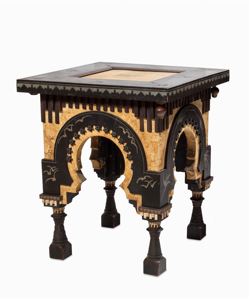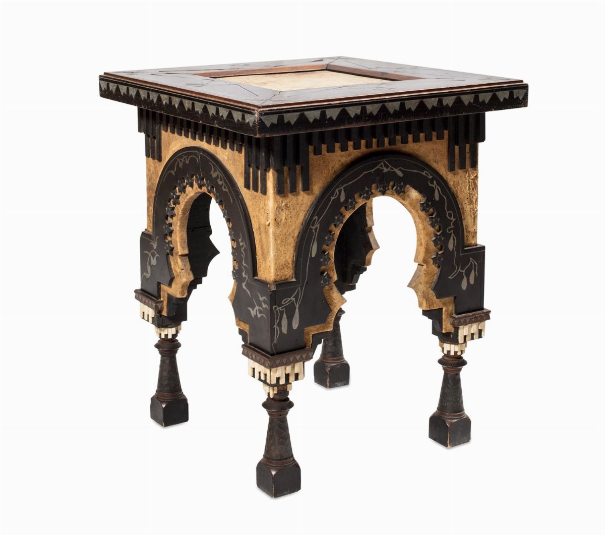 con il centro del piano in pergamena e i quattro fianchi ricoperti in pelle d'asino. Intarsiati in ottone e peltro con motivi geometrici e floreali. Applicazioni in rame sbalzato intorno ai quattro piedi, in avorio e legni pregiati sul resto della superficie.