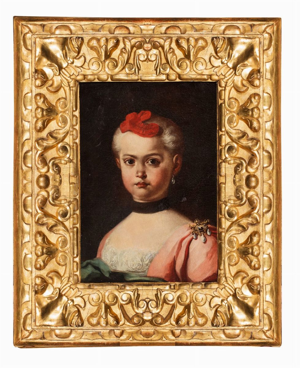 Ritratto di bambina, a mezzo busto, con fiocco rosso in testa e spilla di perle