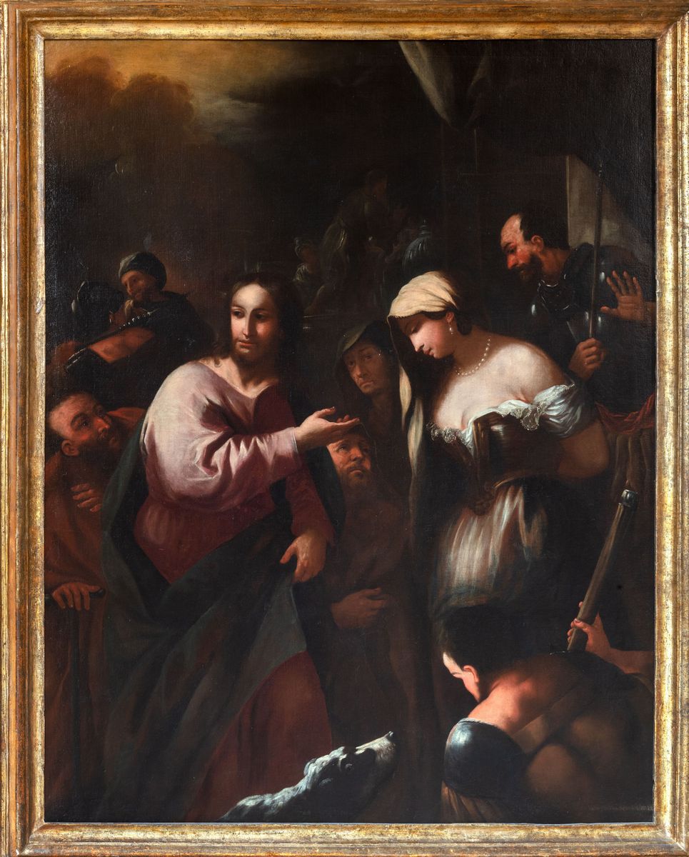 La fortuna del tema del Cristo e l'adultera, usata con intento moraleggiante, è ben documentata nella pittura antica perché il testo sacro permetteva di rappresentare al cospetto di Gesù una giovane modella discinta. L'interpretazione offerta da Luca Giordano, nota in diversi esemplari autografi e in repliche di bottega, è qui riproposta su un grande formato e con un bell'effetto decorativo ancorché di semplice fattura.