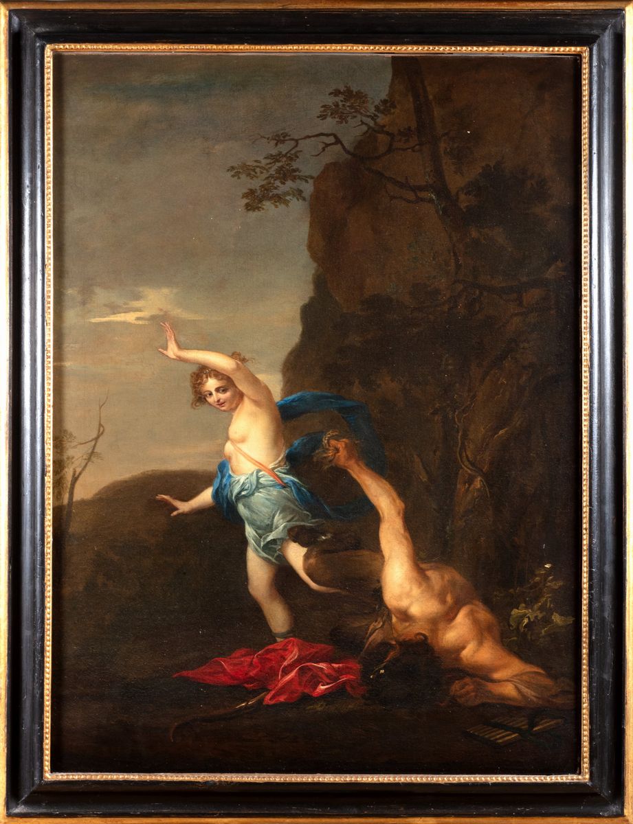 In un paesaggio arcadico, il dio Pan è "raffigurato secondo l'iconografia tradizionale mezzo uomo e mezzo caprone, frequentatore di boschi montani e di gole selvagge, mentre insegue, con intenti amorosi, la ninfa Siringa."