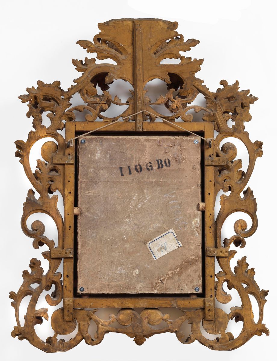 entro importante cornice a cartoccio, in legno intagliato e dorato