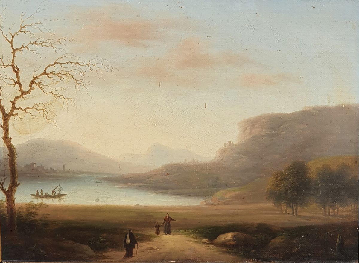 Lotto di tre dipinti raffiguranti paesaggi fluviali con astanti