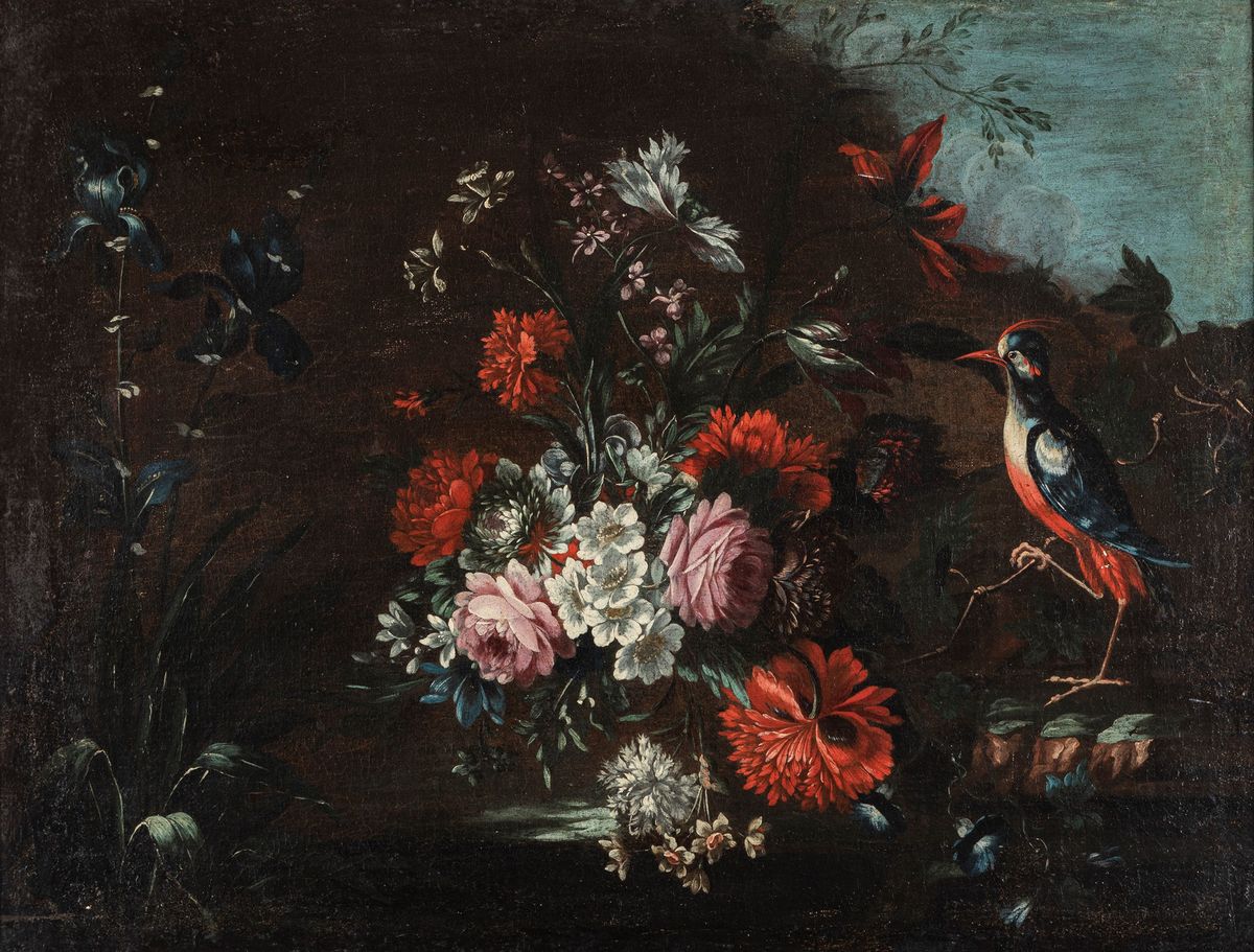 Composizione di fiori con picchio en plein air