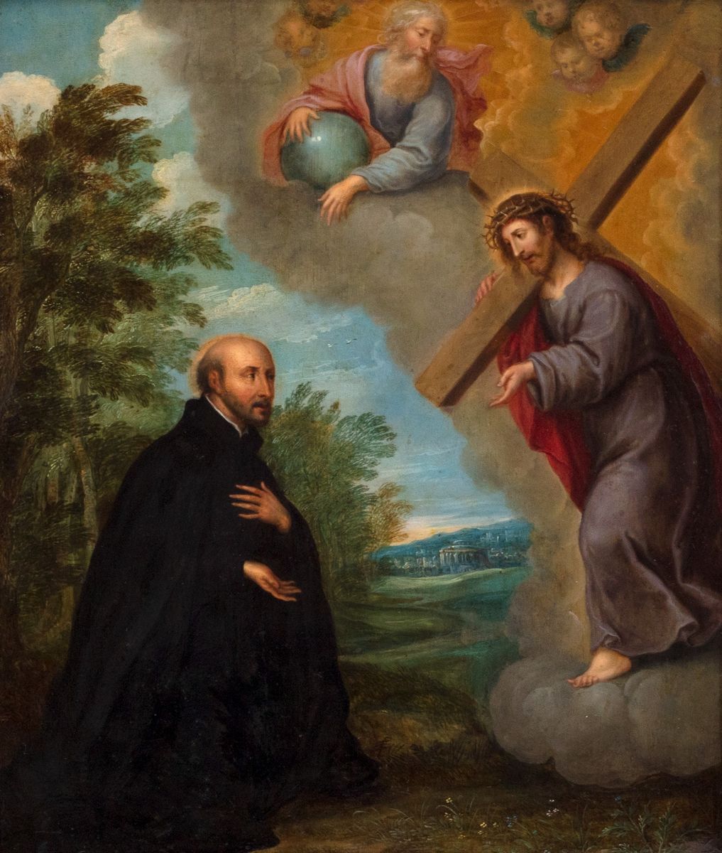 La composizione è da mettere in relazione con un disegno, conservato all'Ermitage di San Pietroburgo, ed un'incisione, in controparte, di Cornelis Galle I, appartenente alla serie Vita Beati Ignatii Loyolae Religionis Societatis Iesv fundatoris ad vivum expressa, edita ad Anversa nel 1610. La pubblicazione fu promossa dal gesuita Pedro de Ribadeneira (1527-1611), autore della prima biografia del fondatore della Compagnia di Gesù e committente anche di una serie di sedici dipinti, di grande formato, dedicati alla vita del Santo, realizzati da Juan de Mesa probabilmente per il Collegio dei Gesuiti ad Alcalà de Henares, oggi perduti.