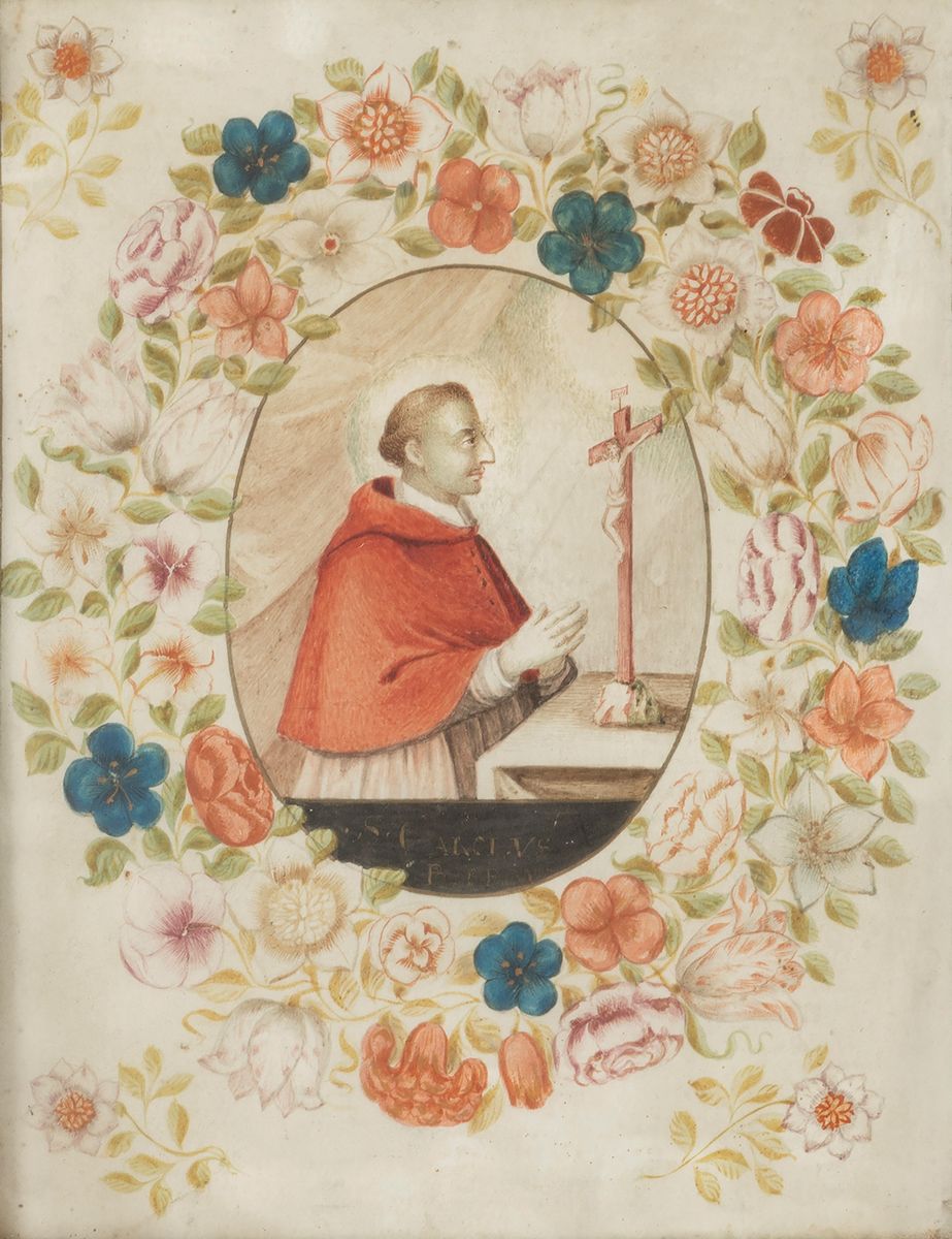 San Carlo Borromeo in adorazione del crocifisso, entro ghirlanda di fiori