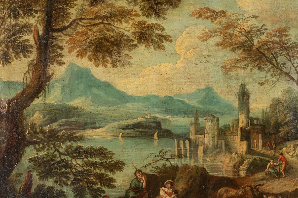 Paesaggio fluviale con pastori a riposo e armenti, castello sullo sfondo