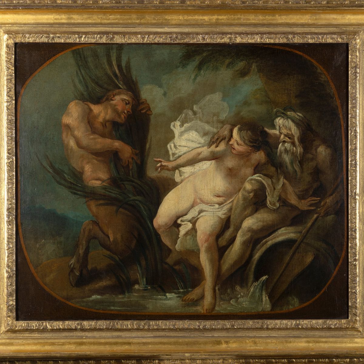 Questo dipinto raffigurante il mito di Pan e Siringa (Ovidio, Metamorfosi, I, 687-712) può essere collegato ad una tela di diversa composizione di Jean-Honoré Fragonard, che tuttavia presenta lo stesso soggetto, le stesse dimensioni e la stessa incorniciatura tendente all'ovale (cfr. J.P. Cuzin e P. Rosenberg, scheda in J. H. Fragonard e H. Robert a Roma, catalogo della mostra, Roma, Villa Medici, 1990, pp. 149-150, dove il quadro è datato al 1761).
