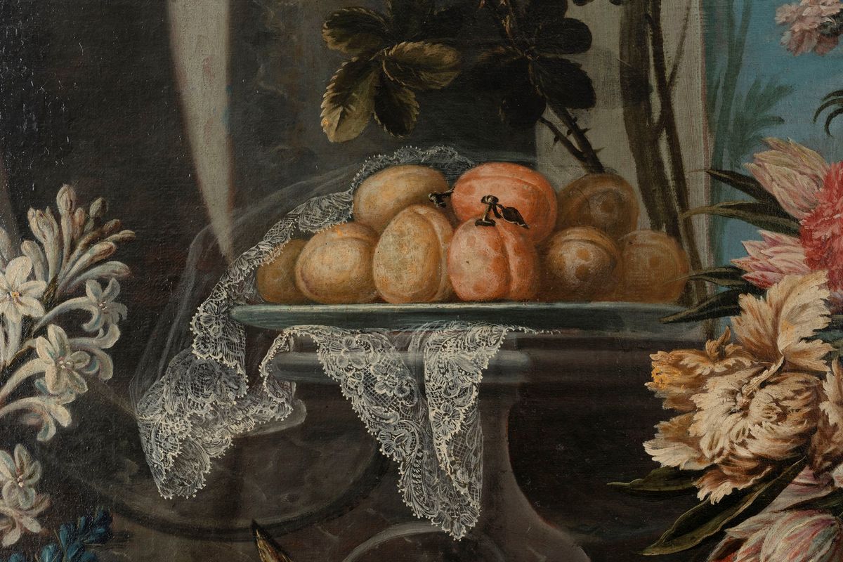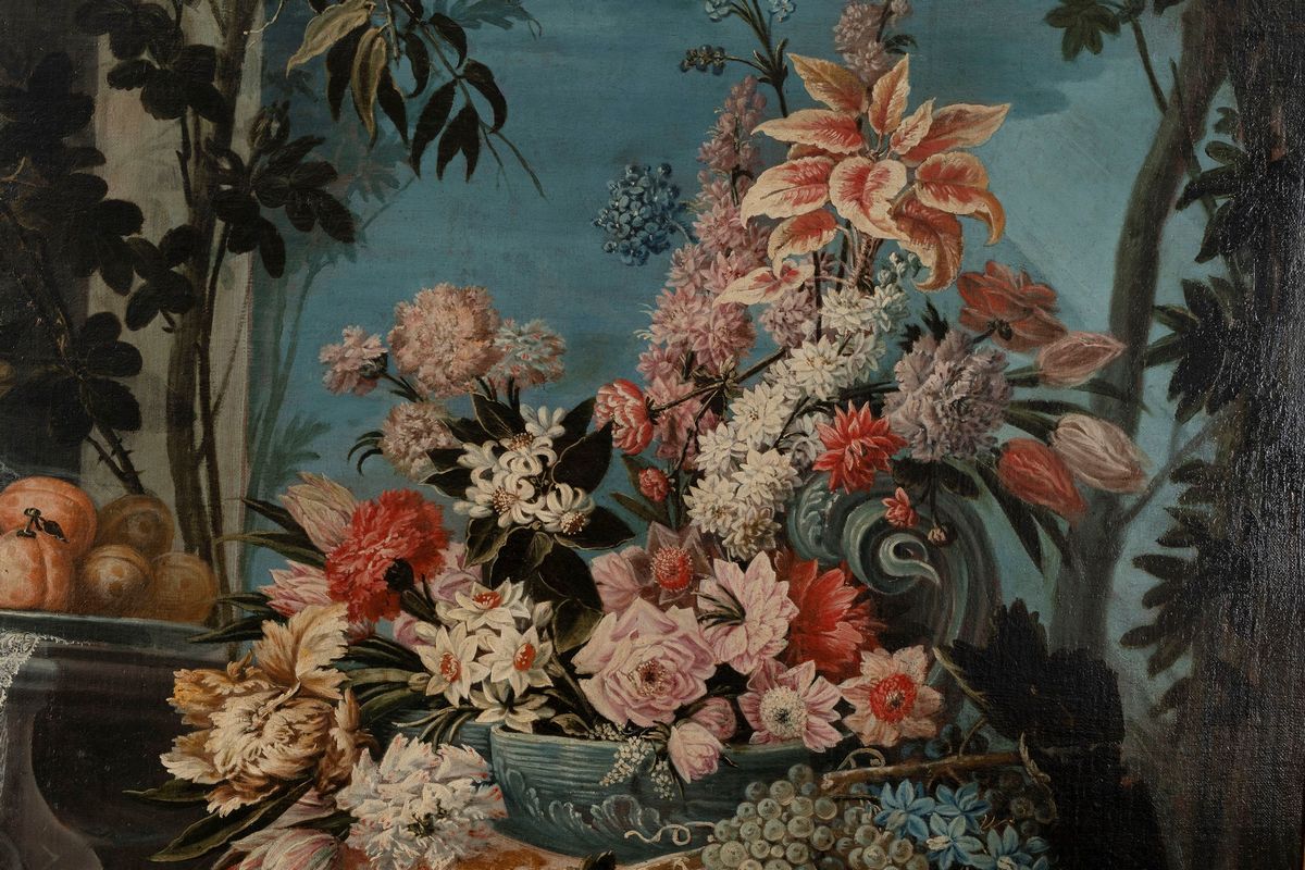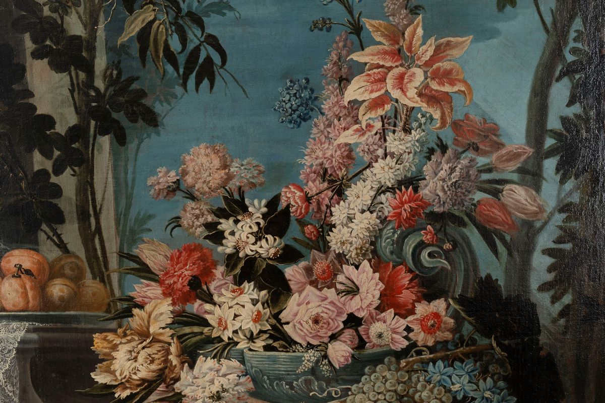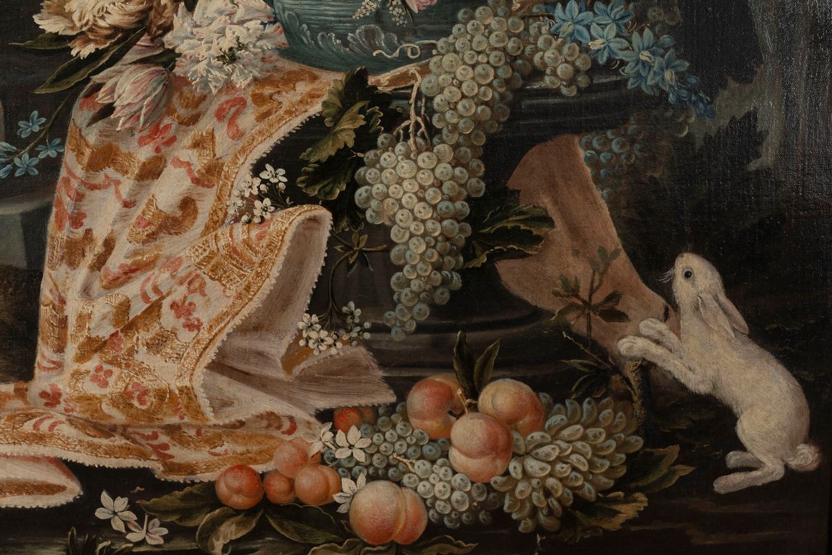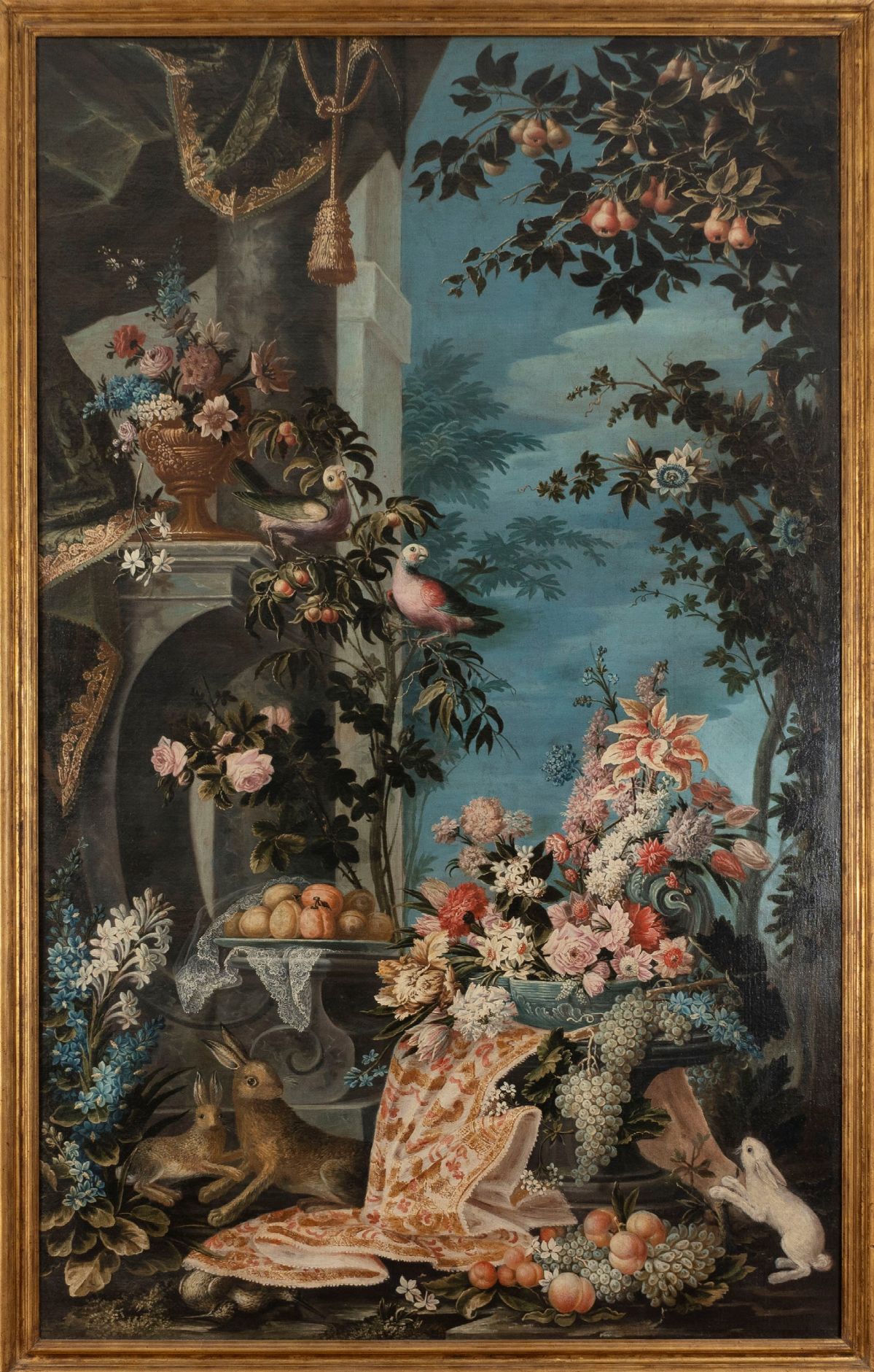 Trionfo di fiori e frutta in un giardino all'italiana con coniglietti e pappagalli